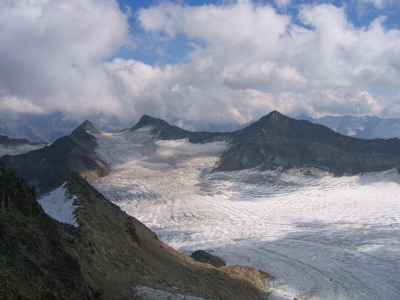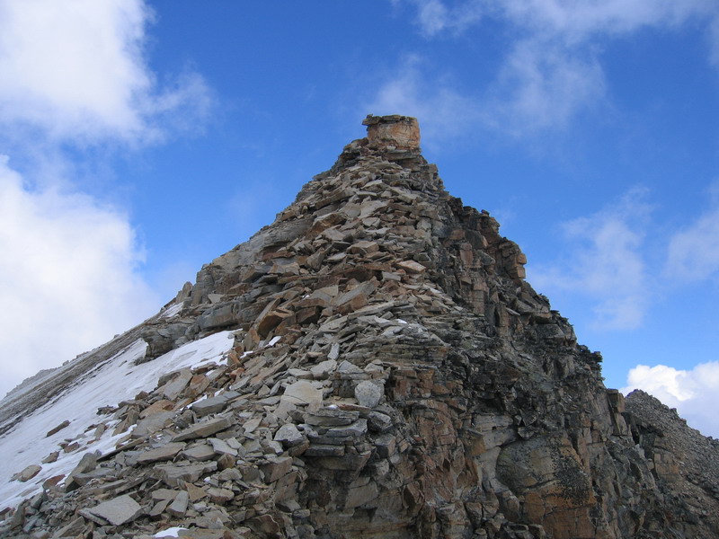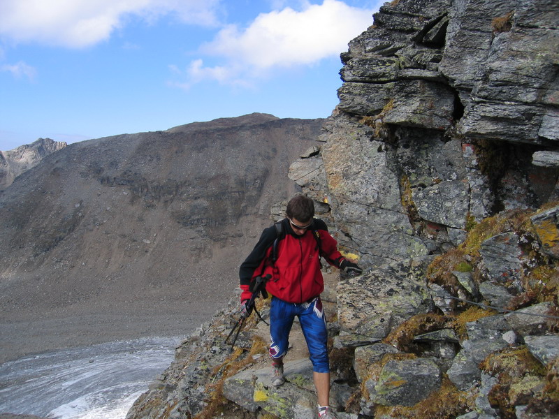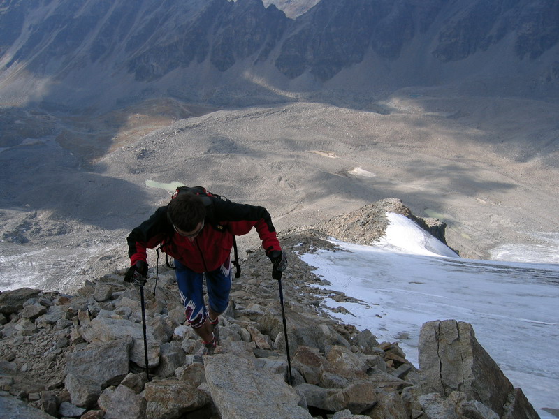 Ďalej pokračuje výstup po suťovom hrebeni okrajom ľadovca. (pozor na voľné kamene) Na vrcholovom hrebeni je ešte niekoľko úsekov, kde si treba dať pozor. Ja som výstup absolvoval v septembri za výborných podmienok. Neprechádzal som žiadne snehové polia. Podmienky však nemusia byť vždy ideálne a prípadné snehové polia, námraza alebo čerstvý sneh by dokázali túto ináč celkom pohodovú trasu skomplikovať.