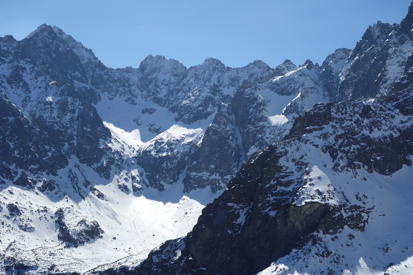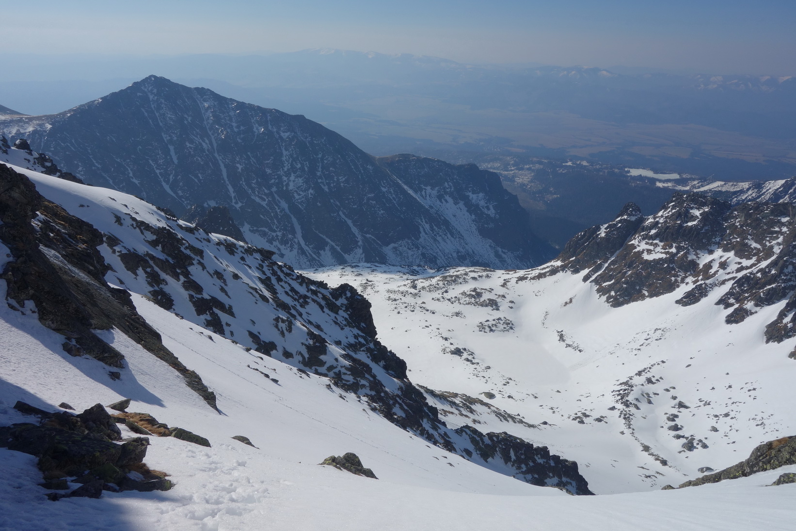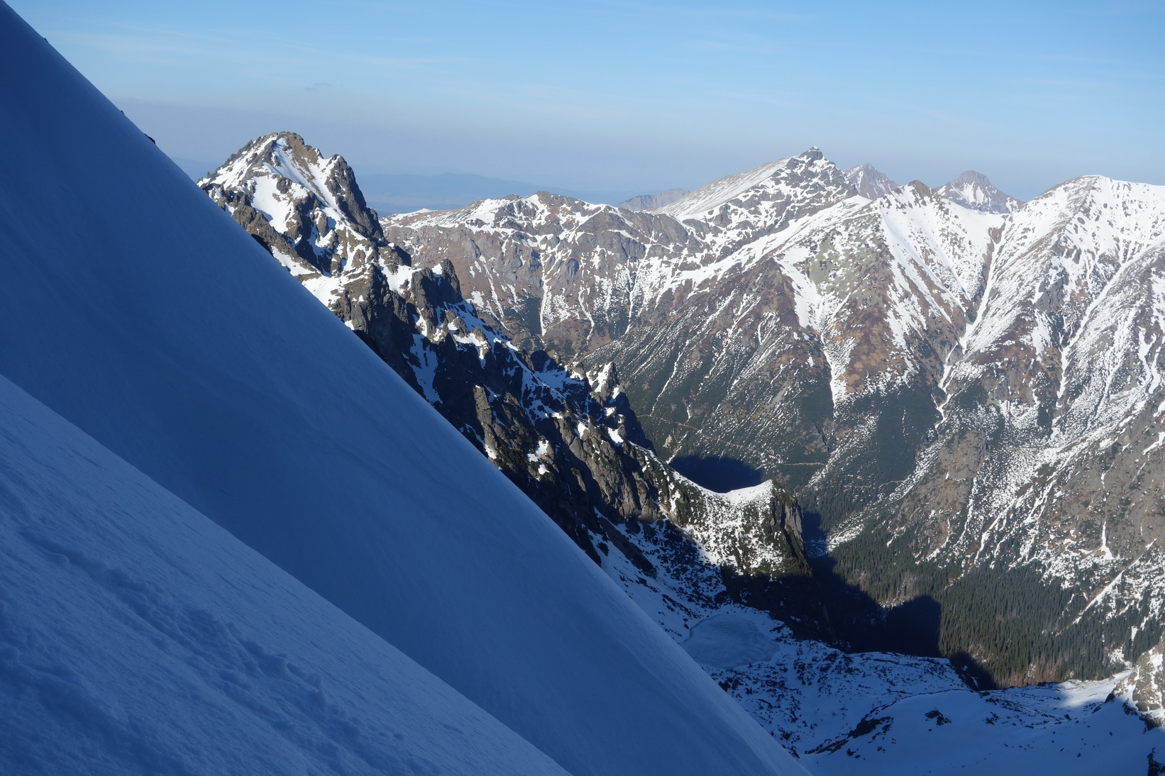 Začnem rovno zjazdom z Váhy. O 9,30 severovýchodný svah ponúka perfektné podmienky a aj po prechode do tieňa je lyžovačka stále veľmi príjemná. Pokračujeme v tomto trende až k Ťažkému plesu. Sme maximálne spokojní a vieme, že výstup na Mlynára, ktorý sa už od rána kúpe v slnečných lúčoch nebude zadarmo a lyžovačka nebude vo firne ale v kejde. Nevadí. Sme uchvátení výhľadmi na severné steny Ganku, Vysokej, Gerlachu a celkovo úplne iným pohľadom na hlavný tatranský hrebeň.