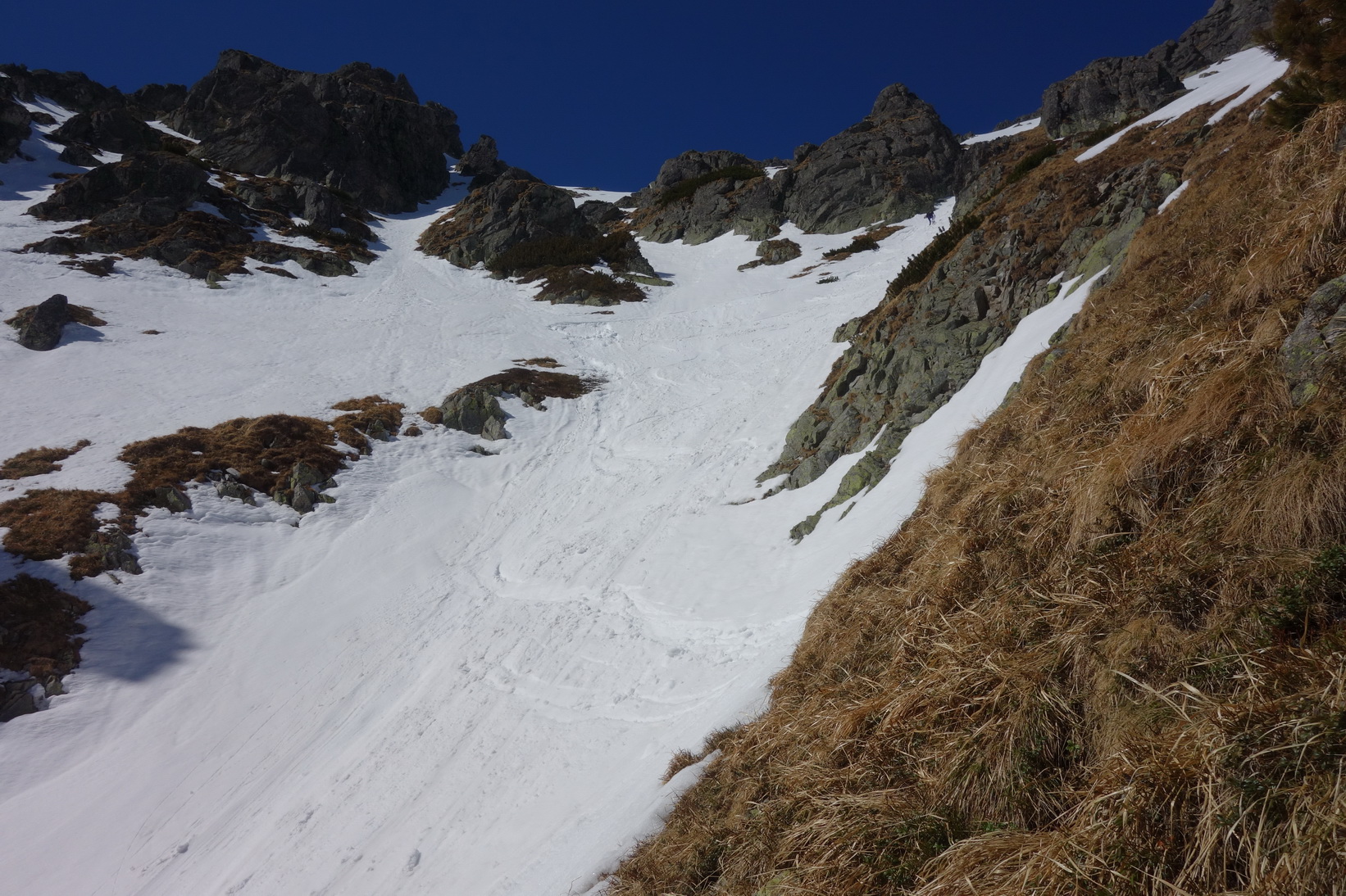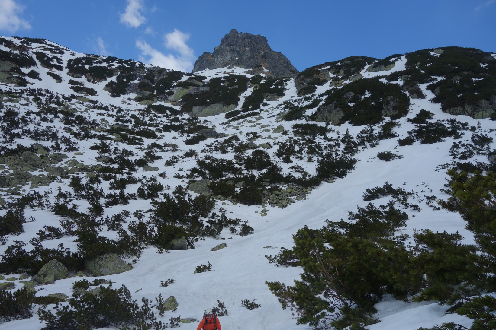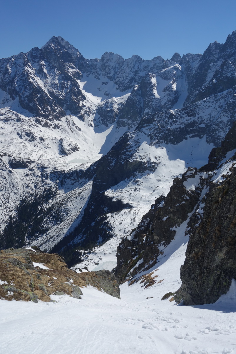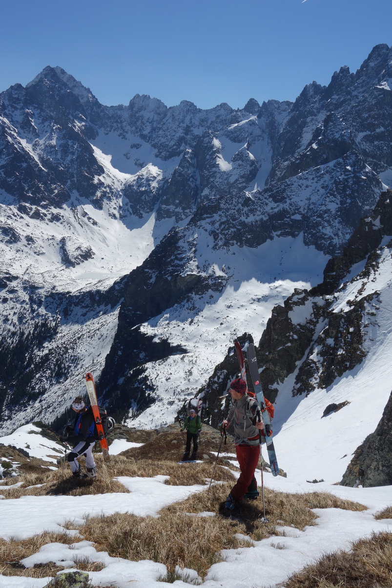 Výstup je náročný, v prehnitom snehu sa prebárame v kosodrevine, obchádzame vežičky a hľadáme rebrom cestu na vrchol. Trávami, rebierkami s kosodrevinou a prehnitým snehom dosahujeme vrchol, kde sa nám otvárajú neskutočné výhľady do Žabej Bielovodskej a Spádovej dolinky. Hodnú chvíľu sa kocháme a do zjazdu sa vôbec neponáhľame. Napriek poludniu sú úvodné oblúky ešte fajn a k Ťažkému plesu to nejako dobojujeme. Ťažká dolina je v tieni a až do rána sa na tom nič nezmení. Neponáhľame sa, no napriek tomu sme za 2 hodinky vo Váhe a oblúky ku chate sú ešte stále perfektné.