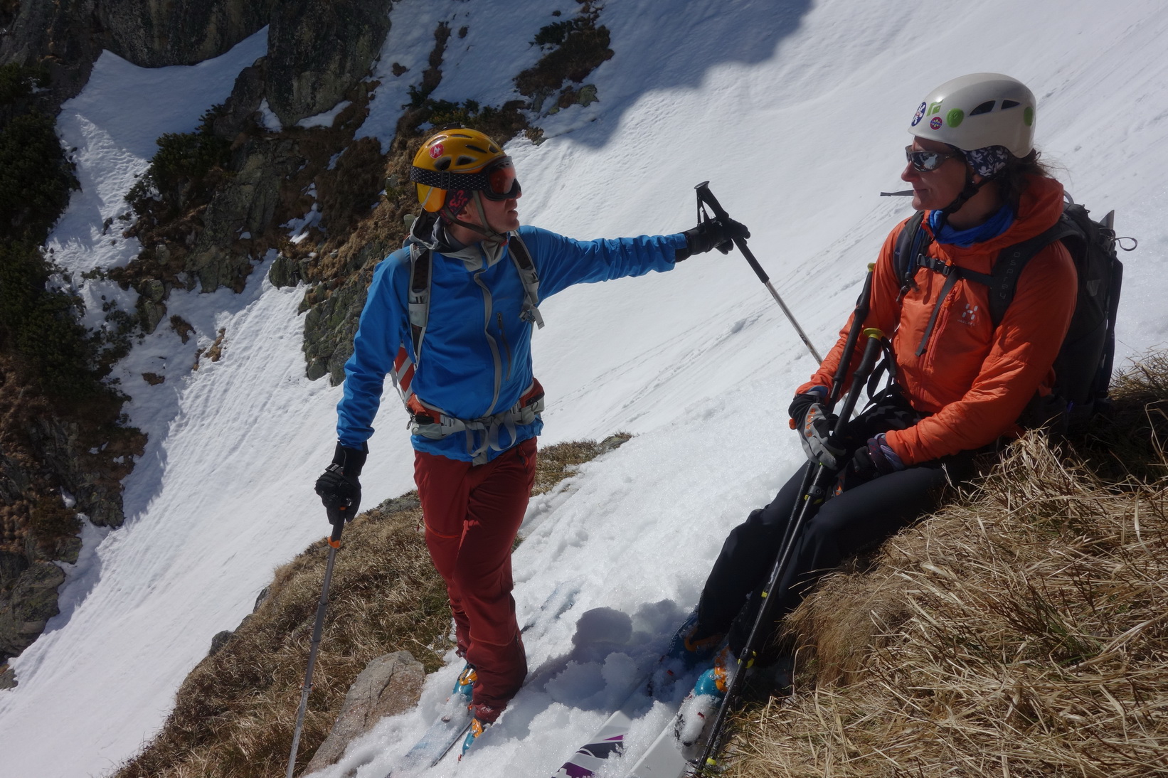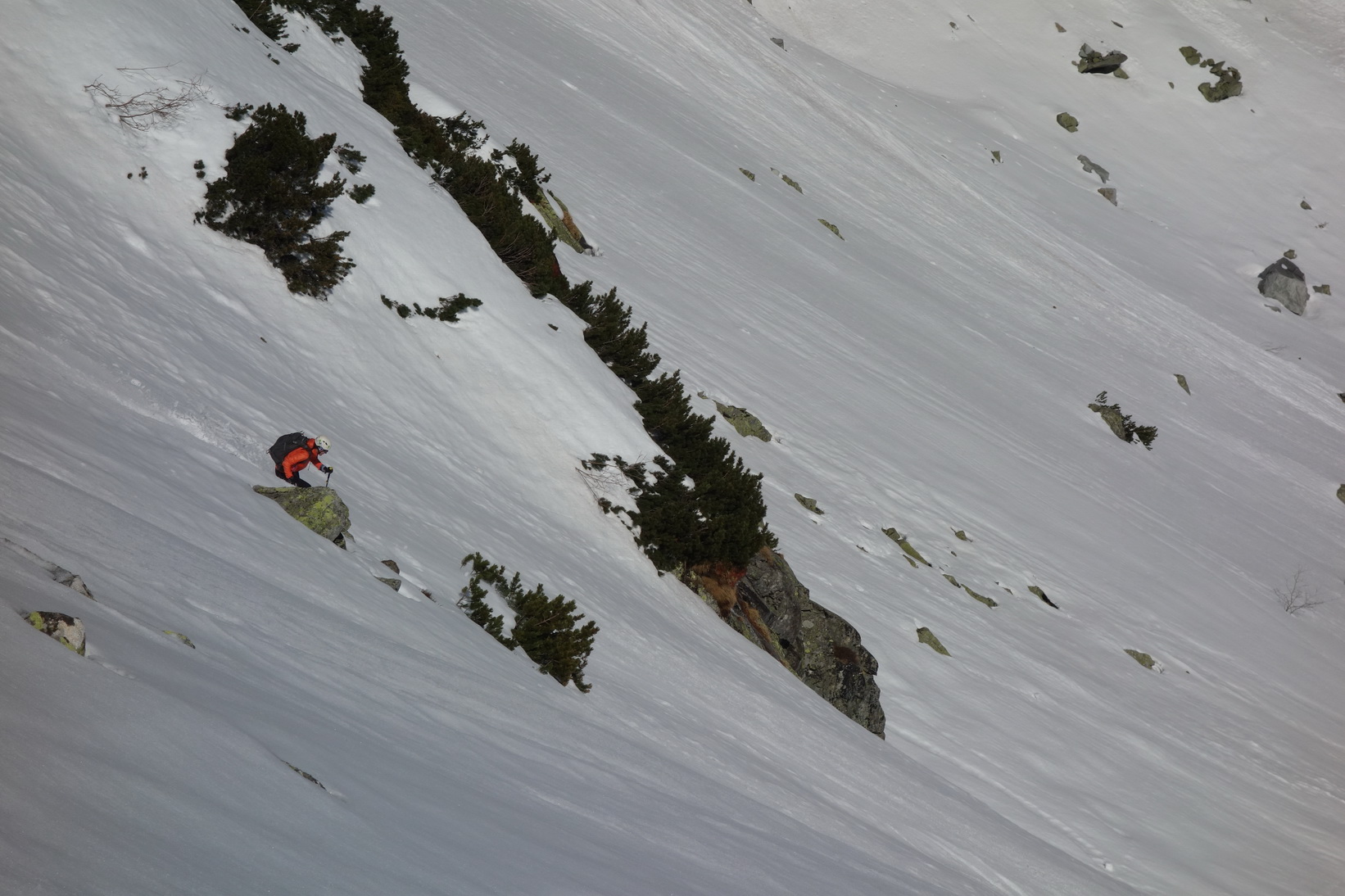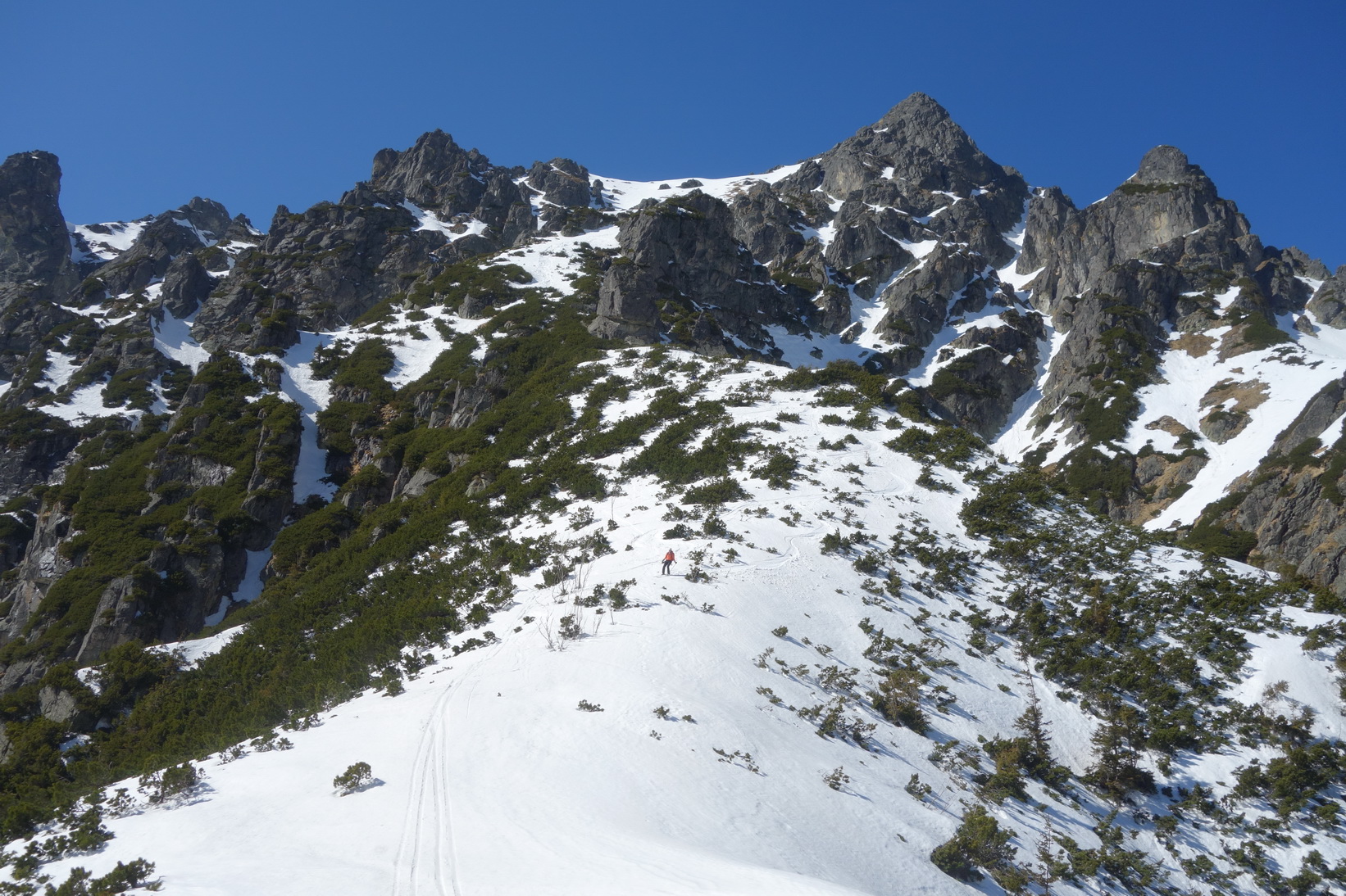 Výstup je náročný, v prehnitom snehu sa prebárame v kosodrevine, obchádzame vežičky a hľadáme rebrom cestu na vrchol. Trávami, rebierkami s kosodrevinou a prehnitým snehom dosahujeme vrchol, kde sa nám otvárajú neskutočné výhľady do Žabej Bielovodskej a Spádovej dolinky. Hodnú chvíľu sa kocháme a do zjazdu sa vôbec neponáhľame. Napriek poludniu sú úvodné oblúky ešte fajn a k Ťažkému plesu to nejako dobojujeme. Ťažká dolina je v tieni a až do rána sa na tom nič nezmení. Neponáhľame sa, no napriek tomu sme za 2 hodinky vo Váhe a oblúky ku chate sú ešte stále perfektné.