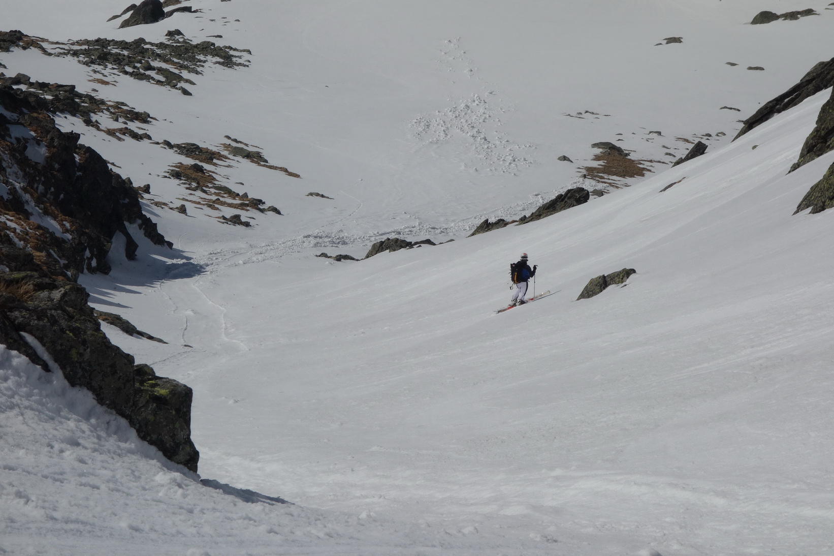 Volíme teda prechod cez Kohútik, ktorý je exponovaný, no zabezpečený reťazami. V zime ich trčí len pár, no aj tak lepšie ako nič. V zásade pohodlne sa prehupneme do Zlomísk a ani nerozmýšľame nad Vysokou, ktorá bude určite rozlyžovaná. Z Ťažkého štítu spadajú k Dračiemu plesu na juh dva žlaby, tak sa spravodlivo rozdelíme a užívame si lyžovačku akurát odmäknutým firnom. Pri plese zvažujeme, či naspäť do Dračieho sedla, no stopy ukazujú priamo dole do Zlomísk popod Dračí hrebeň. Ideme do neznáma a na naše prekvapenie vypíname lyže až pri Popradskom plese.