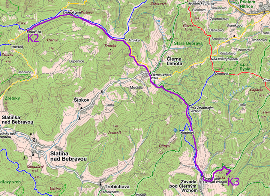 Keďže K2 je Baske, treba nejako obísť Vápeč. Kto neblúdil, obchádza zo západu, cez Hornú a Dolnú Porubu. My zblúdilci najskôr musíme nájsť žltú zostupovku do Košeckého Rovného, čo pri biednom značení a vysokej tráve v noci nie je nič moc. Zato mojtínske kliešte sa tešia (15 som až domov doniesol, fajn suvenír). Strácame jedného člena, vo dvojici skúšame napriamiť cestu cez dedinu Kopec. Červené značky smerom pod Vápeč sú dáke zanedbané už pod dedinou, medzi domami miznú úplne, začínam si vybavovať nejaké články o sporoch s miestnymi vlastníkmi pozemkov. Zas kliešťové lúky nad dedinou, plné rosy, boty mám už asi tretí raz dokonale opraté. GPS definitívne kape, predsa len je pokazené, baterkami to nie je. Našťastie triafame chodník lesom, ktorý vedie priamo na hrebeň pod sedlo Palúch a brieždi sa, už to bude lepšie, dúfam.