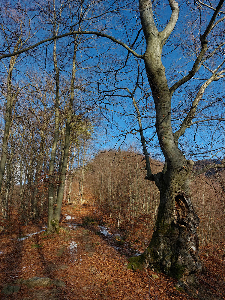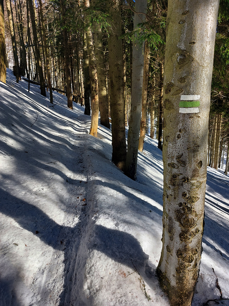 „Južná stena“ Suchého vylízaná, trávy trčia a tam kde nie, betón. Drsný našťastie, zlyžovať by sa to dalo. Na chodníku zato dosť ľadu, tade treba peši opatrne, najmä dolu. Akurát, že fotku nemám, lebo cez sedlo sa mrak prelieval, tak len niečo z toho lesného traverzu: