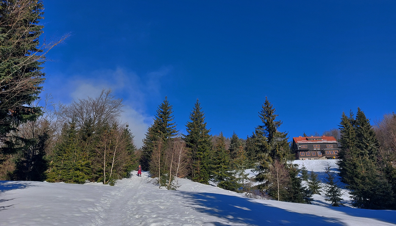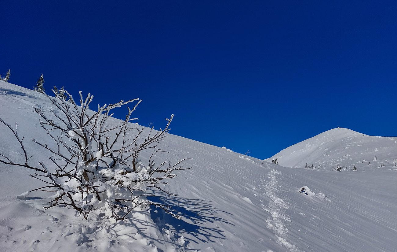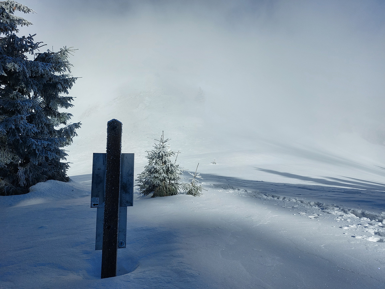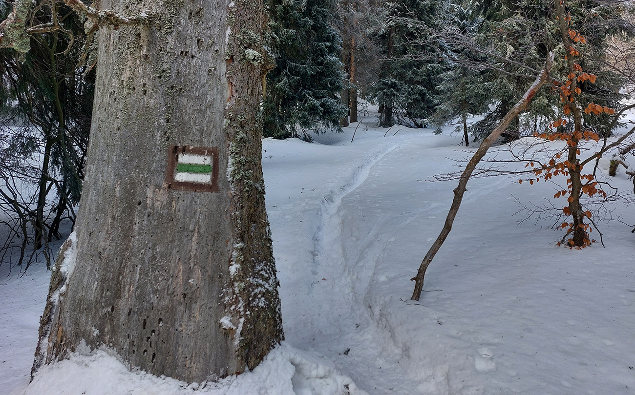Na Malom Kriváni husto a smerom ku Veľkému na pohľad ešte hustejšie, tak som radšej zbehol do ticha po modrej cez Vendovku, do Sučianskej doliny. Menej ľudí tade chodí, tak síce chodník uchodený, hrboľatý, betónový, ale nie šmykľavo ľadový. Aj v strmých pasážach pod „Chvalabohu“. A na Drgovej si auto stojí, ani cenťák nezaborené do toho betónu.