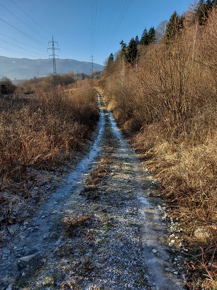 Zaujímavé, že sneh akosi neubúdal postupne, ale zrazu som len klusal po betónovej hline. Ako by uťal. Dole Sučianskou dolinou od Jarolíma by sa potom dalo hádam aj na korčuliach - čistý ľad na ceste, len dve stopy autami vyjazdené. Potom už len cesta podhorím, cez kríky a lúky nazad do Kľačian. Ešte že je to blato na ceste zmrznuté na betón. A na pár miestach tá cesta teraz pripomína skôr bobový tobogán, s dnom bielym a poriadne klzkým. A betónovo tvrdým, samozrejme. No, hádam túto zimu na to ešte niečo napadne.