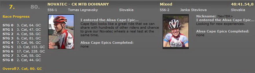 Tento slovenský štart v etapáku podobného typu bol podľa môjho prieskumu vôbec prvým slovenským štartom na niektorom z podujatí "veľkej trojky" - Trans-Alp, Trans-Rockies a Cape Epic. - Rád by som sa mýlil, ak mi niečo ušlo napíšte do diskusie.Jedinečná na pretekoch Cape Epic je určite organizácia. Pojazdná dedina sa sťahuje každý deň. Veľký spoločenský stan, sprchy. stany pre pretekárov a doprovod... Dokopy 780 ton materiálu prepraví denne 20 kamiónov.