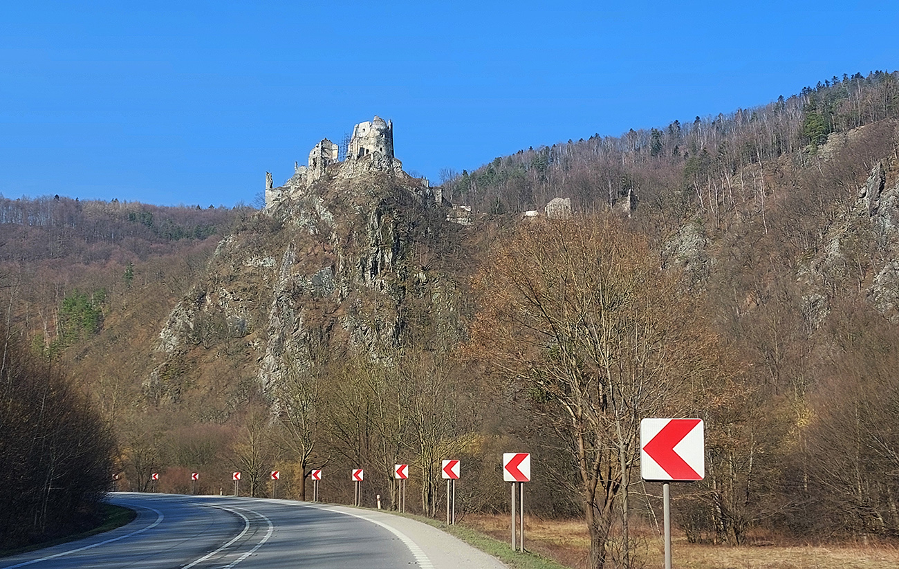 No a samozrejme, Starhrad ani nestihne zmiznúť vzadu a vpredu už sa na brale nad cestou vyníma navštevovanejší a zachovalejší hrad Strečno alebo nový hrad. Aj keď má len o pár desiatok rokov menej ako starý. Cesta k nemu je poriadne „osieťovaná“ a pod (dúfajme) dostatočne zabezpečeným bralom je koniec strečnianskeho prielomu – točím cez parkovisko do podjazdu, idem si dať ten okruh okolo vodného diela.