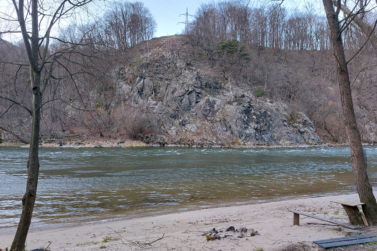 Hneď za niekoľkými prvými zákrutami sa na pravom, opačnom brehu začínajú ukazovať bralá rezervácie Krivé, ktoré padajú až pod hladinu. To najznámejšie bralo odstrelili koncom 19. storočia, keď už takmer žiadnym pltníkom nehrozilo rozbiť sa na ňom. Besná skala je prvá z dvojice, známej aj z miestnej legendy o žiarlivej vdove a jej krásnej chovankyni. Práve od Besnej začína Váh obtáčať prvý, menší meander – Krivé. Inak priamo oproti skale je na ľavom brehu príjemná piesková pláž, keby niekto chcel: