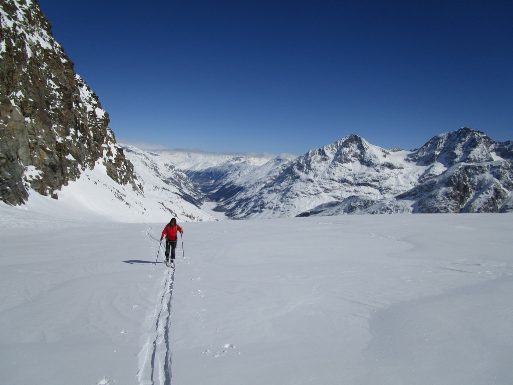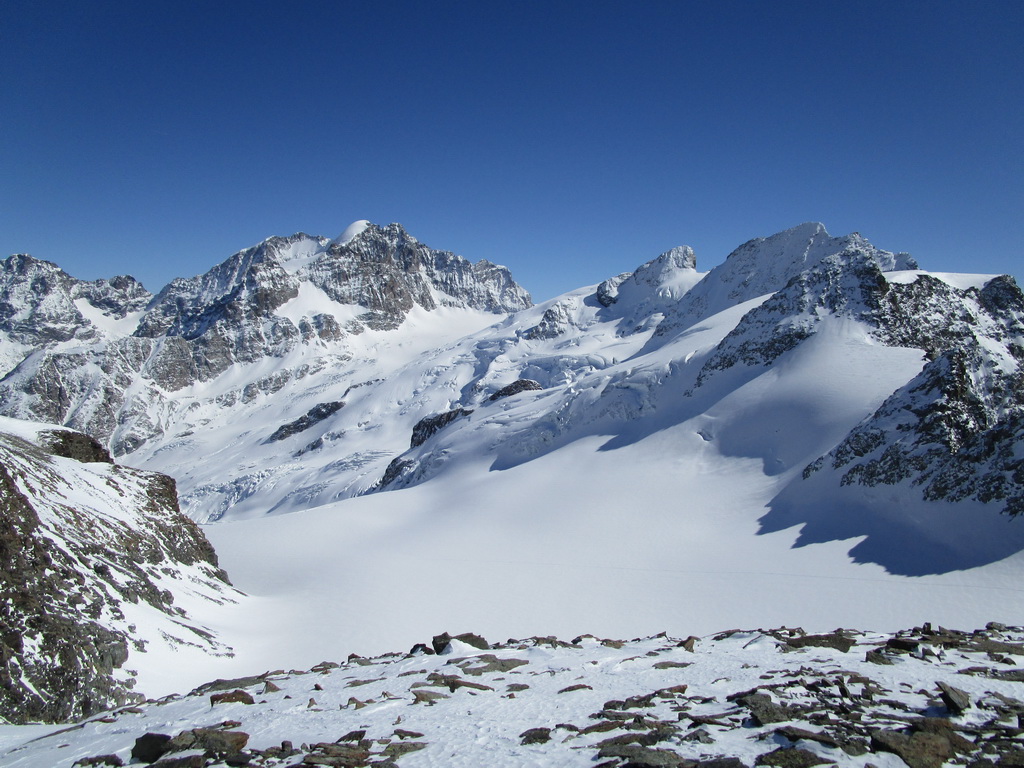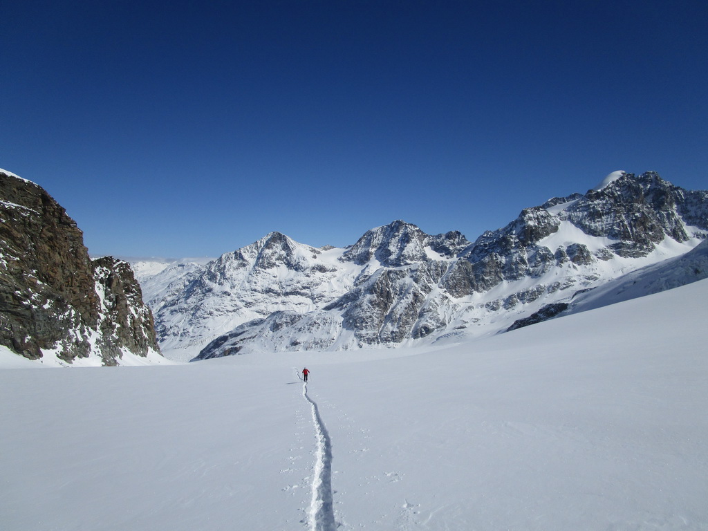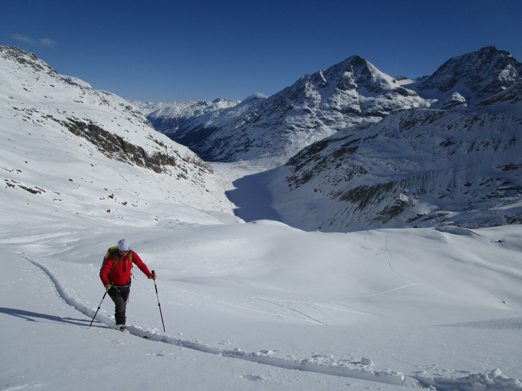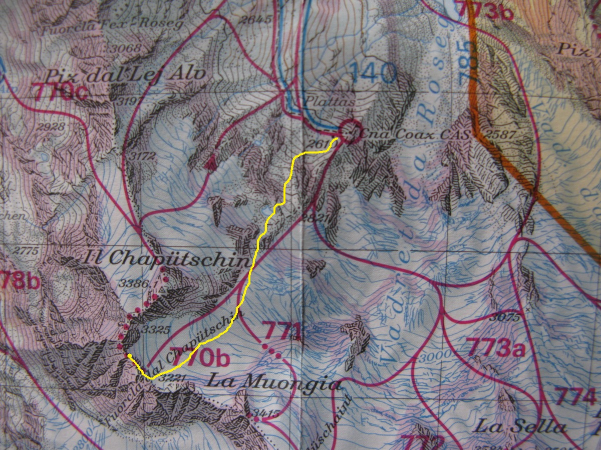 Vybrali sme sa hore svahom popod Chaputschin traverzujúc úbočia mierne vľavo. Ponad zrázy siahajúce až ku ľadovcu sme sa dostali na rampu ktorá je zo spodnej časti ohraničená ľadovcom a zhora už je stena Chaputschinu. Zaujímavé miesto s úžasnými výhľadmi. Pretraverzovali sme na plochý ľadovec. Nebezpečenstvo trhlín tu bolo minimálne a tak sme sa v pohode po miernom ľadovci dostali až do Fuorcla Chaputschin. Odtiaľto sú výborné výhľady do Val Fex ale vidieť oveľa viac...