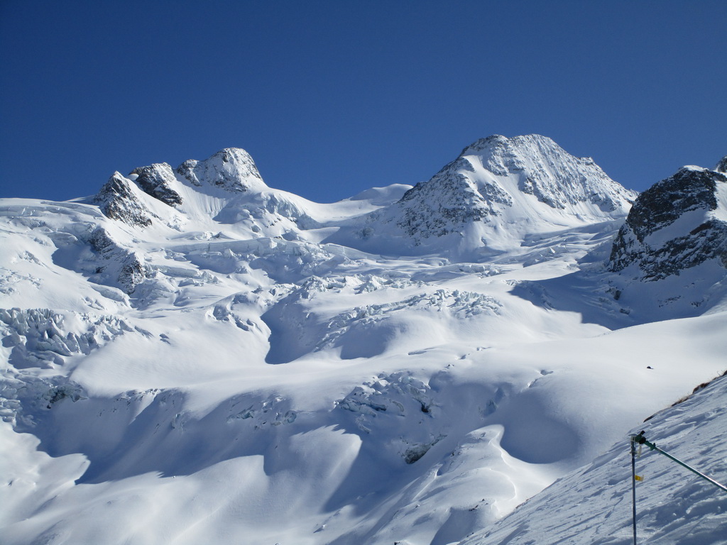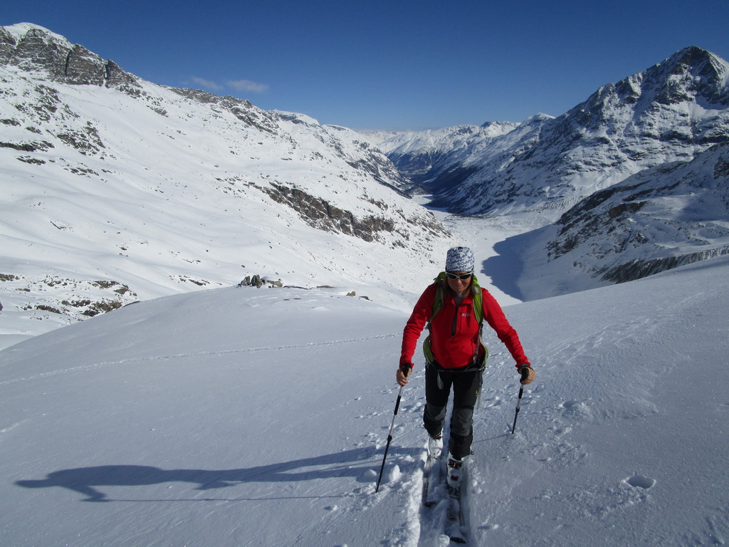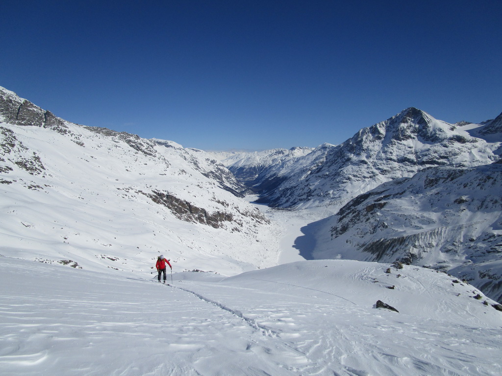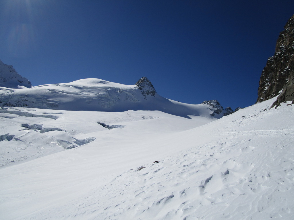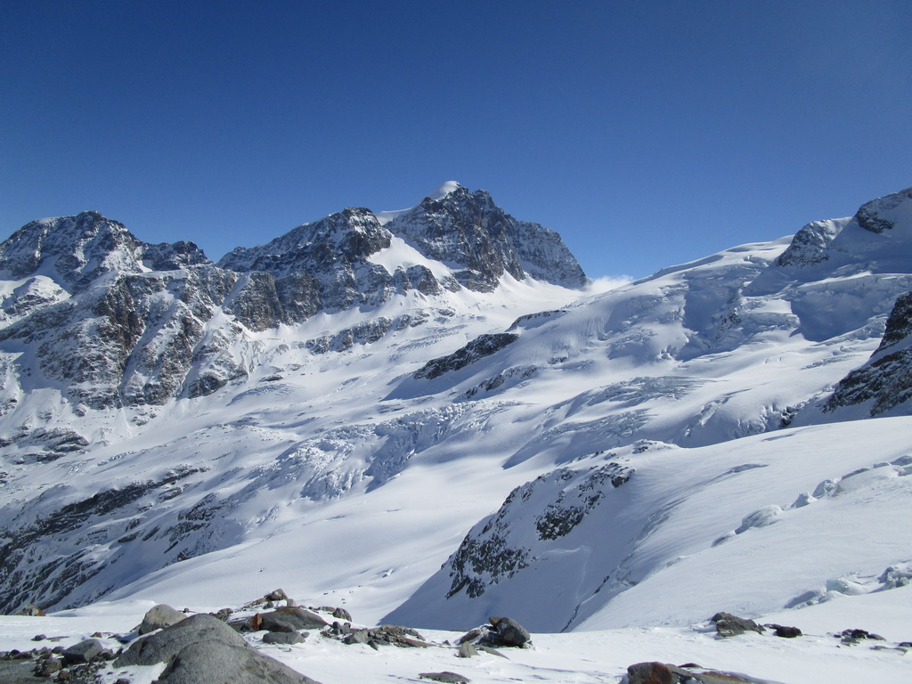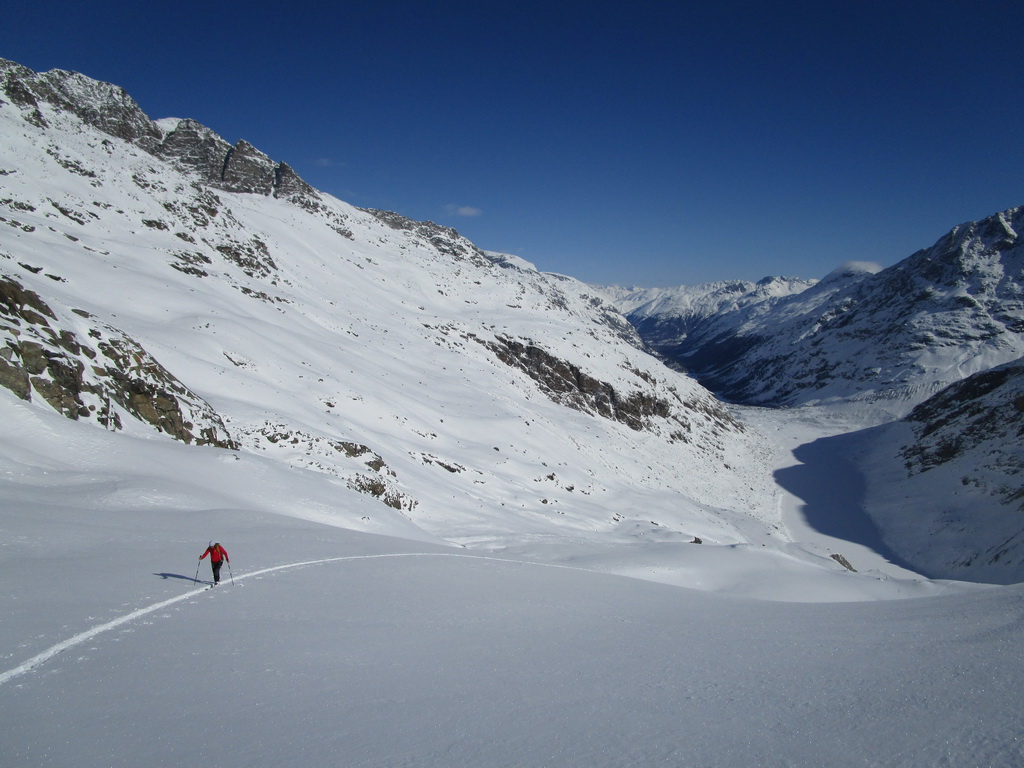 Vybrali sme sa hore svahom popod Chaputschin traverzujúc úbočia mierne vľavo. Ponad zrázy siahajúce až ku ľadovcu sme sa dostali na rampu ktorá je zo spodnej časti ohraničená ľadovcom a zhora už je stena Chaputschinu. Zaujímavé miesto s úžasnými výhľadmi. Pretraverzovali sme na plochý ľadovec. Nebezpečenstvo trhlín tu bolo minimálne a tak sme sa v pohode po miernom ľadovci dostali až do Fuorcla Chaputschin. Odtiaľto sú výborné výhľady do Val Fex ale vidieť oveľa viac...