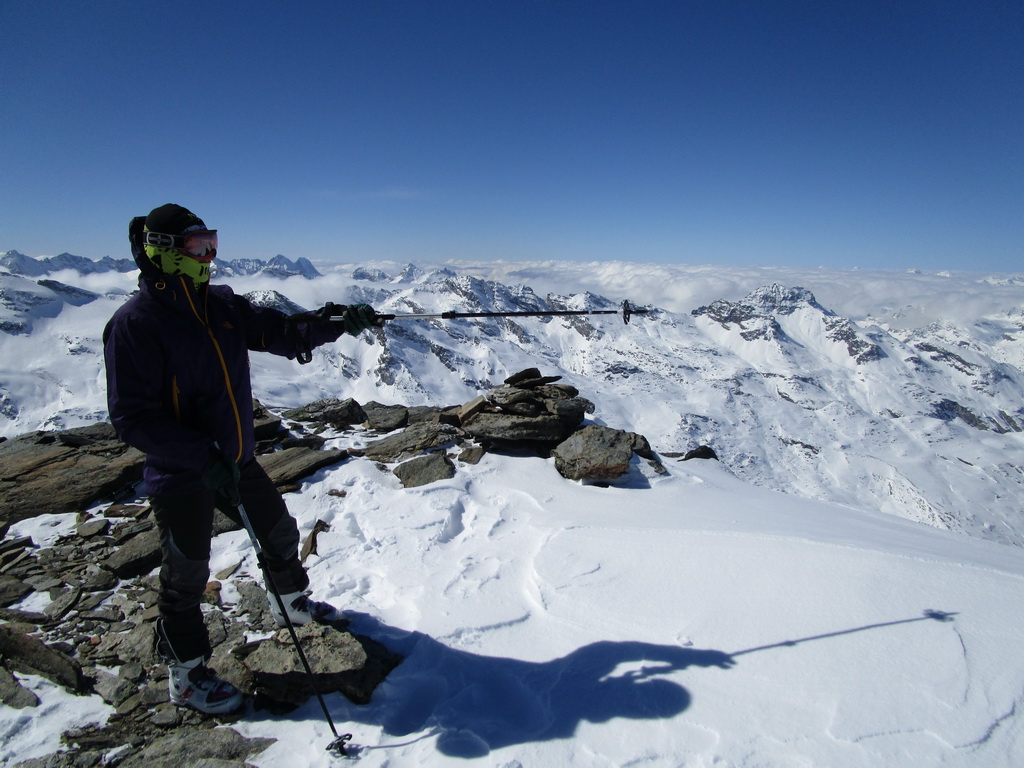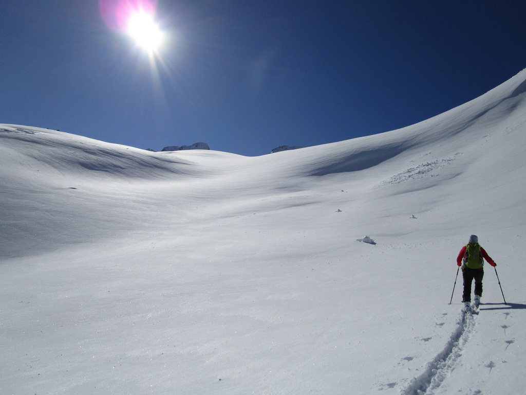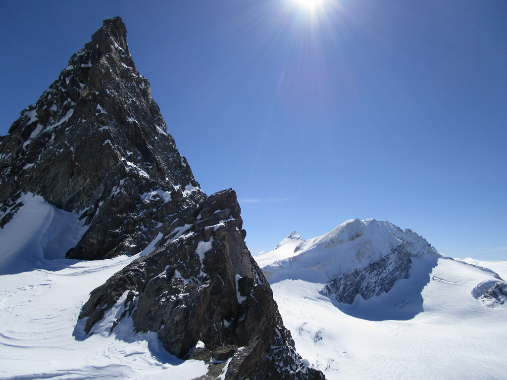 Po hrebeni s výhľadmi všade naokolo sme postupovali smerom ku vrcholu Chaputschin. Otočili sme sa na kopčeku s ešte značným odstupom od vrchola. Čakal na nás parádny zjazd prašanom ale aj kôrkou od vetra naspäť ku chate. V ten deň sme sa ešte museli presunúť dole do doliny ku hotelu Roseggletscher.