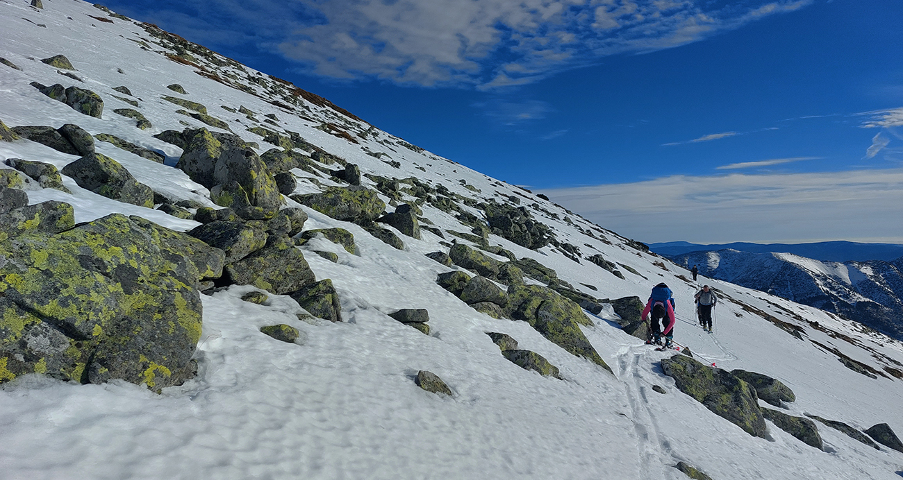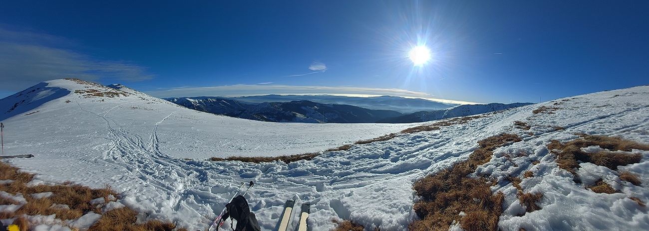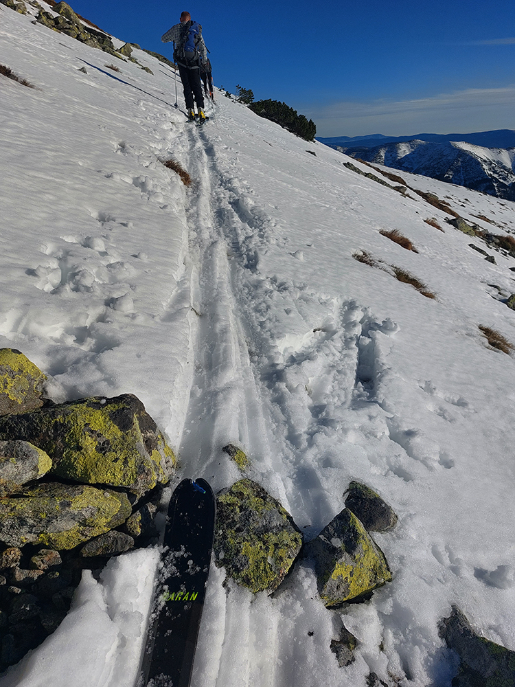 Stopa vyleštená a pevná, ale nešmýkalo sa ani v strmších pasážach – pekne to lepilo. Pásy samozrejme mokré durch, už po pár metroch a čím vyššie, tým aj teplota vzduchu vyššia. Miesta aj snehu našťastie dosť aj pomimo zjazdovky. Aj čistý bol, len buriny z neho trčali ako dôkaz jeho nedostatku.