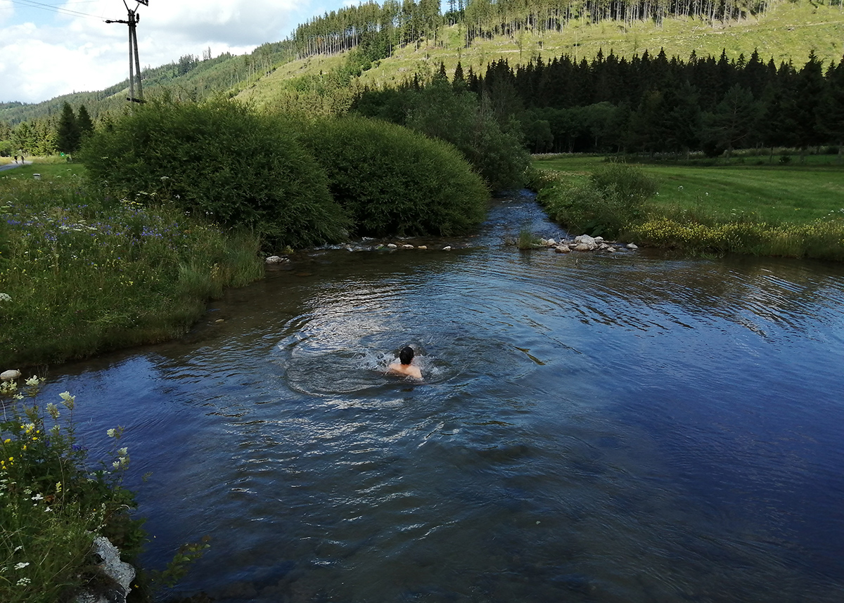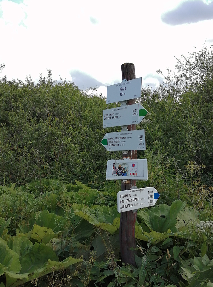 Pri Staníkovskej horárni dávame stopku, SNP spomienky nemôžeme ignorovať, na to sme príliš do témy zainteresovaní. Tak to tam obzrieme a pofotíme. Na svoj vek to tam ešte vyzerá zachovalo a dobre, miestni sa zrejme starajú a nezabúdajú. Potom už len dole, sledujúc cestu, celkom fajn asfalt. A samozrejme žasneme nad mostíkmi a viaduktami, múrikmi a odkopmi pre železničku, doteraz je vidieť, kade to ťahali. Zbiehame v pedáloch až na Výpad, a tam ľaľa, krásny brod u smerovníka pri moste. Teplo je dosť, ale nechce sa mi vyzliekať z lepkavých elasťákov, a tak iba Peťo ako rekreant skúša liečivé účinky vody potôčika. Balneoterapia in natura.