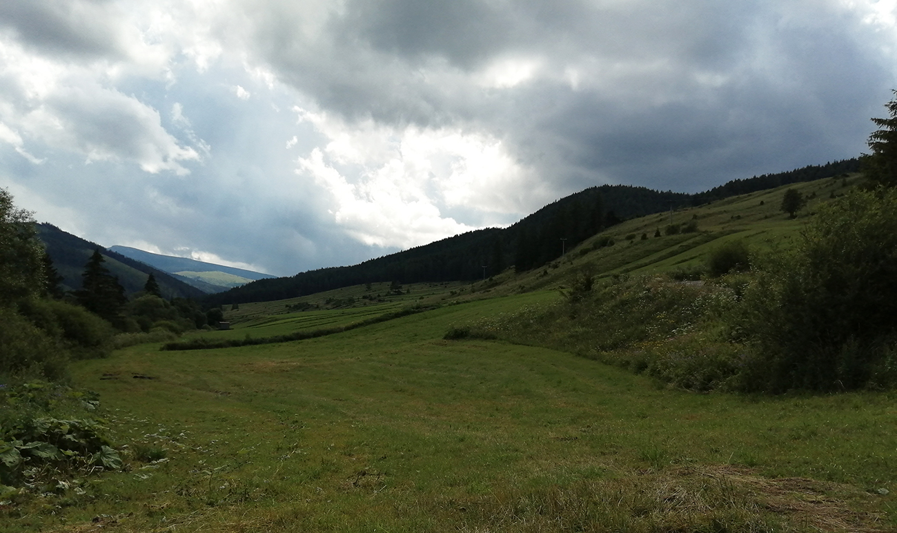 Na Panskej holi malé občerstvenie, zopár telefonátov treba Peťovi vybaviť a len hútame, že kam ďalej. Lebo na Kráľovu hoľu je nám to priďaleko a aj mraky sa zbierajú na letnú búrku. I keď vietor občas už aj tie jesenné tóny zamieša do teplomera pocitov na mokrom tričku. Nuž hopsa do sedla... Samozrejme najprv netrafíme na žltú, ale nevadí (výhľad na východ spoza Panskej hole je prekvapujúci), pár metrov došliapeme nazad. Potom krásnym traverzom, češúc vysokohorskú a dovysoka rastúcu trávu, kde nevidíš pod koleso od bohatosti porastu. Sem - tam mierne hore - dole, ale ku koncu smerom na Budnárku taký padák, že až odtŕhame vlhký podklad a brzdy spievajú. A tak radšej zosadáme, lebo kotrmelce s bikom som sa ešte nenaučil vyberať. Ale v takom úzkom a strmáku aj zosadnúť z bicykla nie je len tak. Neskôr prejdeme cez potok a rezko hore zase trávu porozhŕňať a sme na hrebeni Nízkych Tatier, Pod Košariskami. Pár minút a sme na Andrejcovej pri útulni.