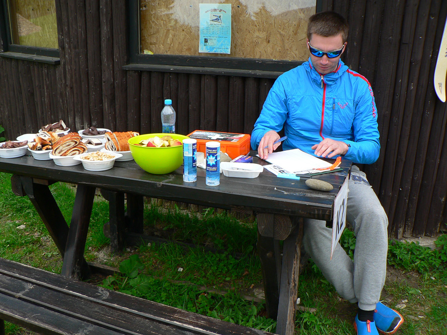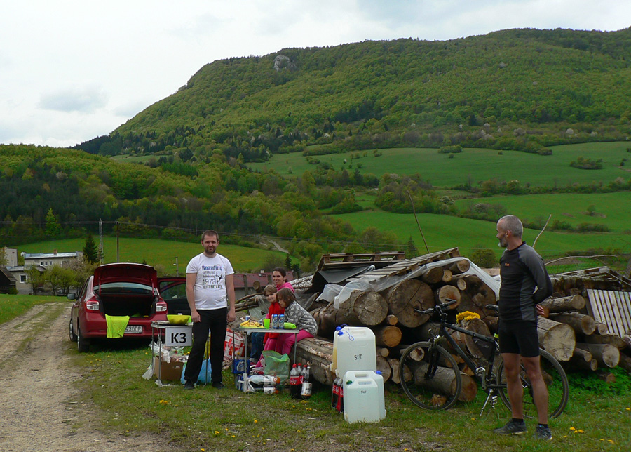 Výhľad aj na Hornú Porubu s treťou živou kontrolou a krmítkami, ktoré akurát niekto z vedúcej trojky opúšťa. A za dedinou stúpanie pod Hoľazne a pohľad do „cieľovej rovinky“. Len sa tam ešte dostať, saaaakra – strášne prudko dole, nohy už cítiť, aj kŕče sa už trochu hlásia.