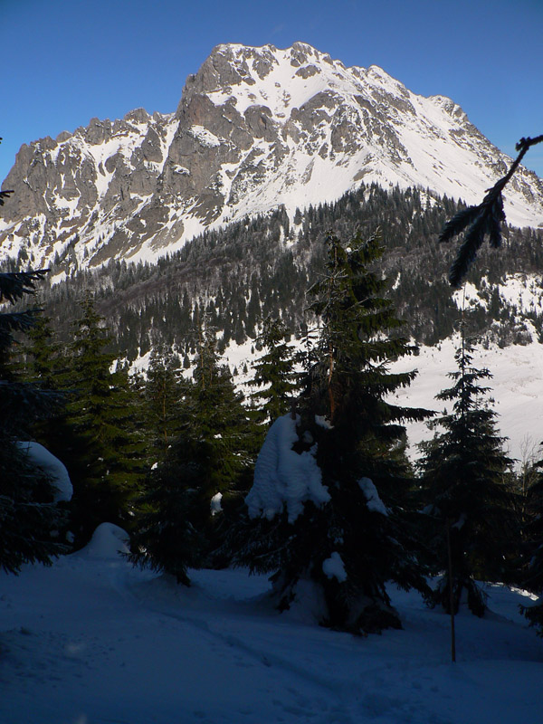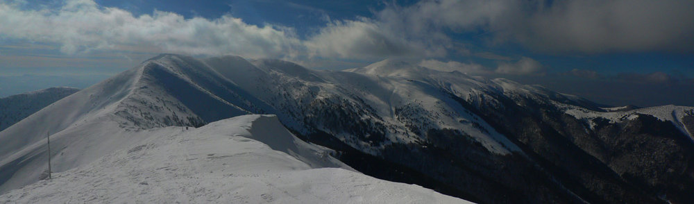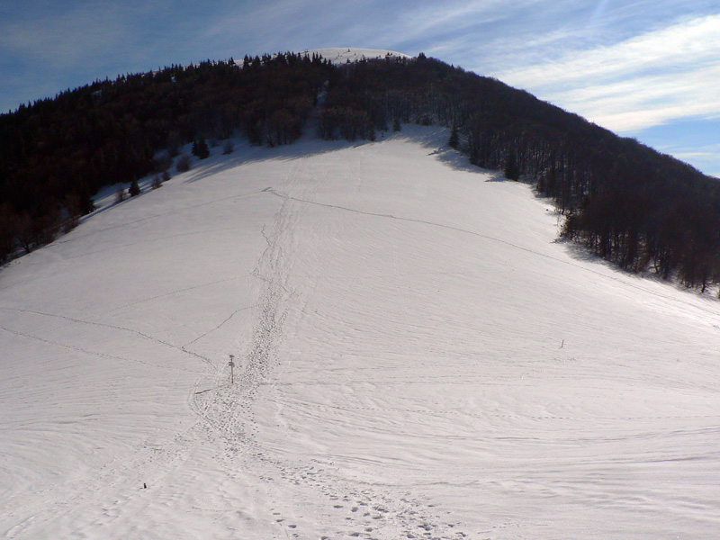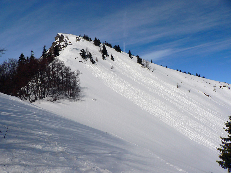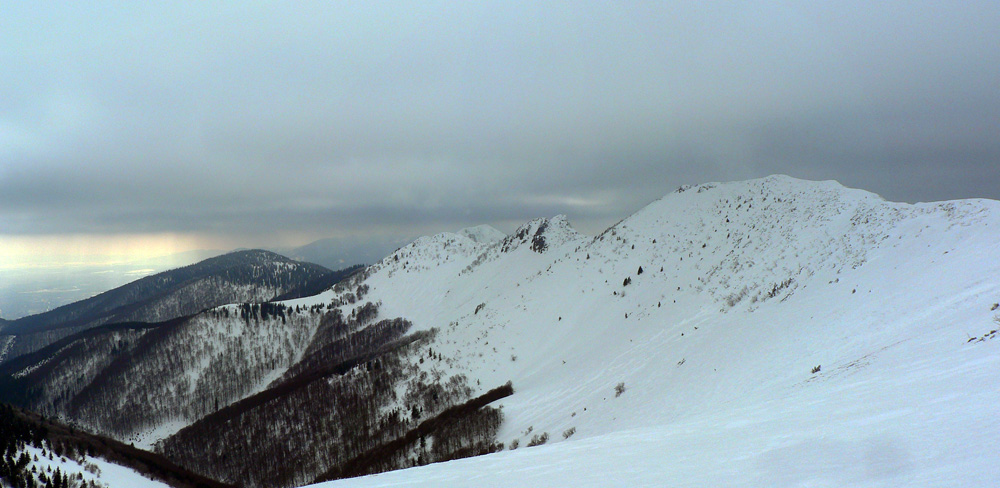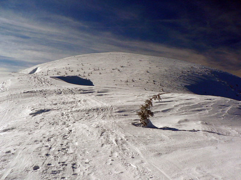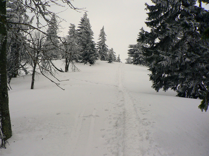 Trištvrte hodinka na Stoh - dole v lese sa stopa bije s dierami po pešiakoch, zle sa kľučkuje pomedzi stromy, ale aspoň je tu normálny sneh. Nad lesom už pohoda po tvrdom snehoľade. Jedovatý severáčik dobiedza, ale aspoň nie je priteplo. Najsamparádnejšia lyžba dňa dolu vyžehleným žľabom do tradične vylízaného Stohového sedla a začína typický krivánsko-fatranský hrebeň. Ostrý, s chodníkom prevažne na južnej strane, cez malé preveje, okolo kosodreviny a kameňov. Mať tak pravú nohu kratšiu :-) Niekde už musím aj po tráve, snehu je tohto roku málo. Hádam ešte čosi prisneží, inak toto bude dosť krátka sezóna.