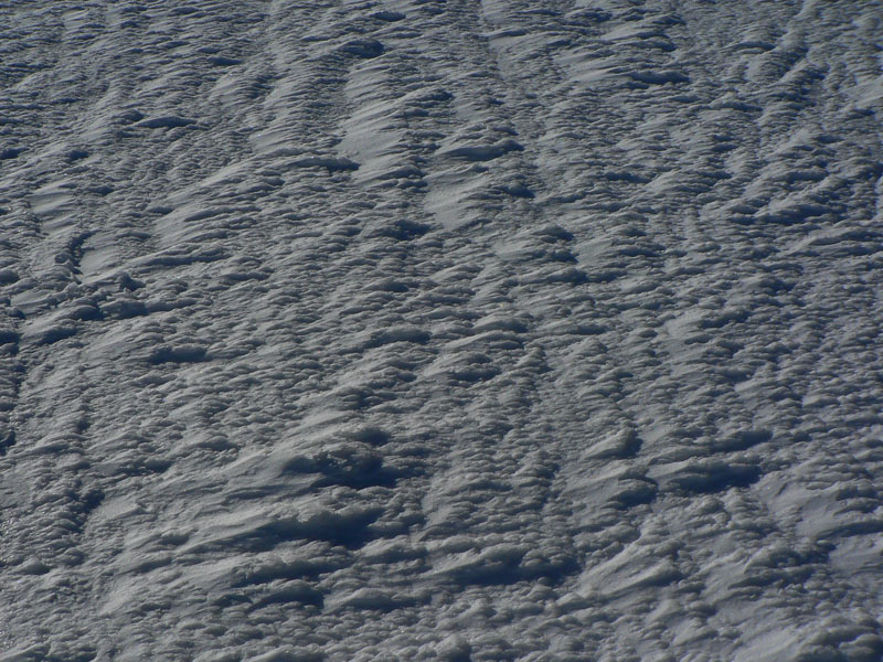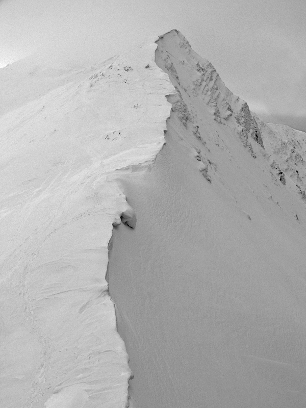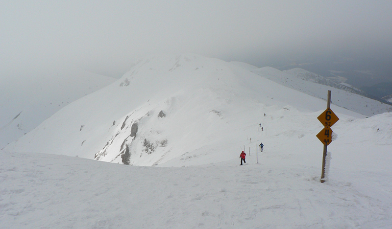 Malý Kriváň je v mlieku, pred ním na pár strmších výšvihoch pomáhajú haršajzne, ale tiež by sa to dalo všetko poobchádzať. Dolu do sedla Priehyb to ide už bez pásov, aj keď na konci s výdatnou pomocou rúk, tesne popod hrebeň. Stratenec sa dá prejsť v pohode po hrebeni po vrchu kosovky, žiadne kľučkovanie ako v lete. Smerovník v sedle Vráta nevidno, celý je pod snehom. Cez Biele skaly treba lyže ešte preniesť, ale na Suchý je už len na skok a zas na pásoch. Nasleduje predposledná lyžovačka do sedla pod Suchým. Krátka síce, ale pekná, firnovo - jarná. Korisťou je stratená termoska, čo akurát vyliezla spod roztopeného snehu.