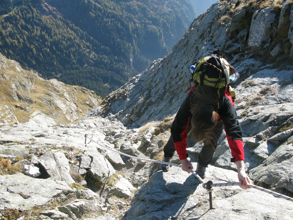 "Nejde tam oficiálna značka, ale je to taká tajná trasa pre domácich. Je čiastočne zaistená oceľovým, čiastočne konopným lanom, miestami treba liezť nezaistený. Obtiažnosť cca 2+." Vysvetľuje Jens.