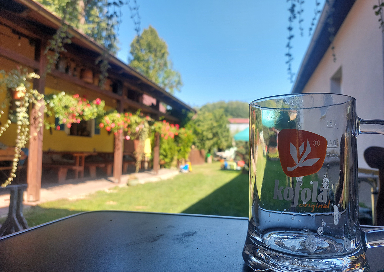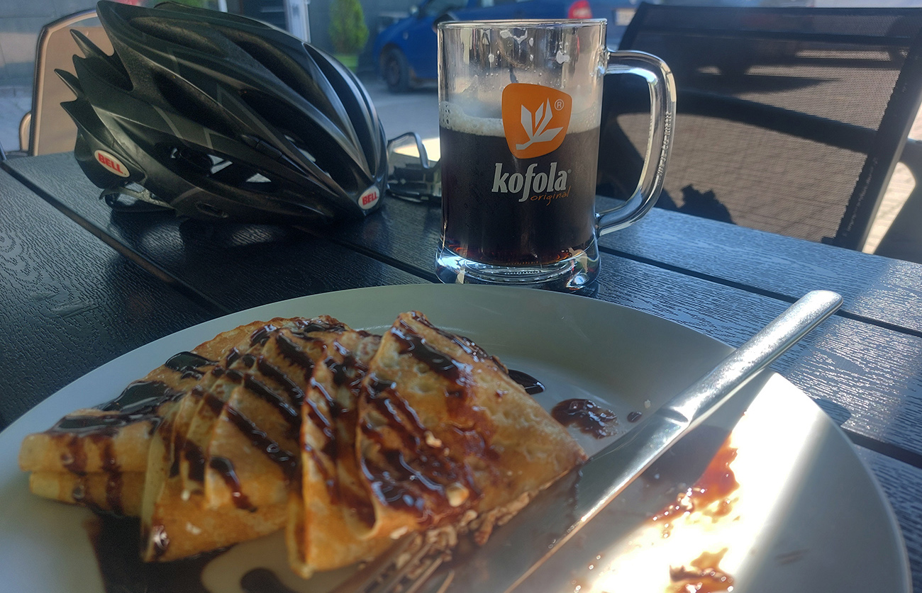 Udrel obeda čas, pizzéria Marčello v Jelšave stála mi v ceste priamo pri ceste, ako na objednávku. V tieni pod slnečníkom. Tak veľká chladená a palacinky z menu - to ma musí poháňať v nasledujúcom, náročnom úseku. Polievku som si radšej ale nedal, to by bolo už moc, neohol by som sa nad rajdy.