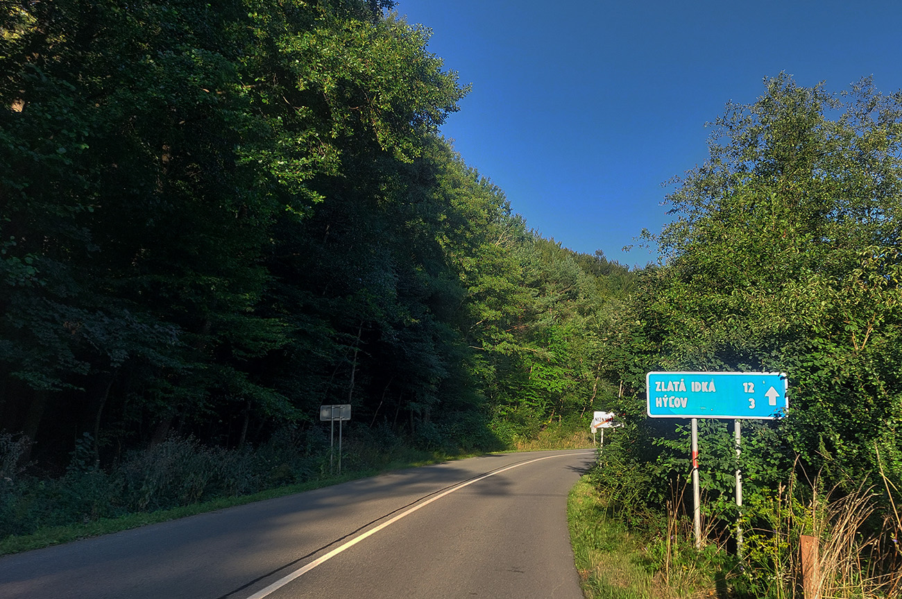 Stúpanie na Zlatú Idku ako počas zlatej hodinky: ostré slnko zozadu a všetky autá oproti, do roboty. Kopec mierny, malá píla len na kúsku za Nižným Klátovom. Chládok v doline príjemný. Odbočka na Rudník a ešte trochu do kopca lesom, po novom asfalte. Zjazd do dediny naopak po dosť hrboľatom, staršom „drsoňovi“, ale bez dier. Z lesa von, do panorámy Košickej kotliny.