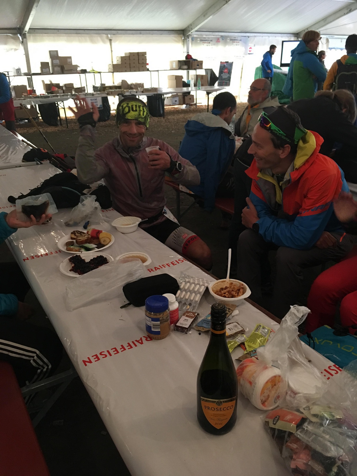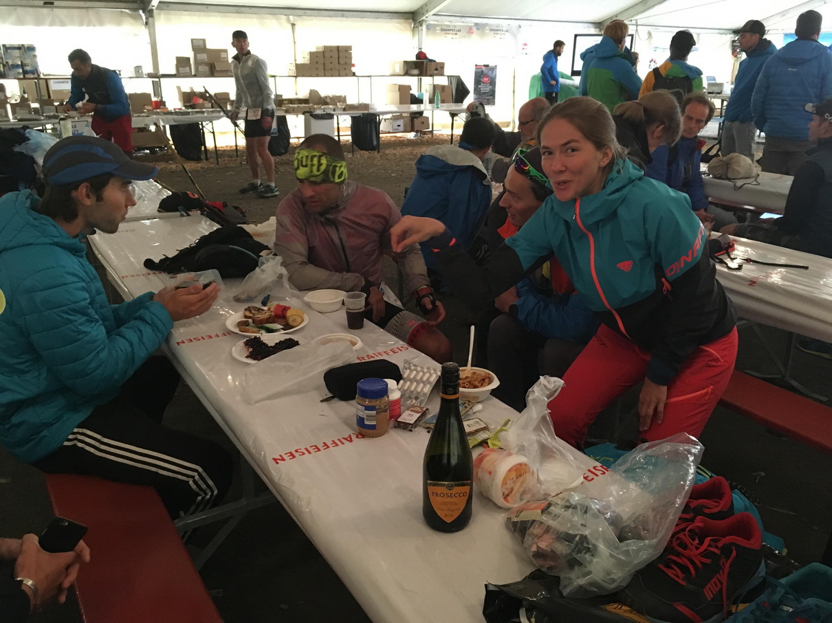 Ďalšie km šli rýchlo. Po asfaltke sa mi bežalo parádne až pod Champex-Lac. Toto stúpanie si pamätám z CCC. Bolo tu horúco, totálne som sa vtedy uvaril. Champex-Lac 125.km +7400v.m. a tam celá banda už čakala v dobrej nálade. Všetko pripravené. Suché boty zatiaľ neprezúvam, nohy mám suché, tak načo. Čo sa týka jedla, nemám na nič chuť, ale Matúš do mňa znova naleje polievku a cestoviny, aj keď len trochu, tak to udržím, dám si kávu, obliekam igelit vrch aj spodok a rukavice. Von sa riadne rozpršalo odchádzam do dažďa už len posledné tri kopce – posledný maratón a niečo. Psychológ Kaisik a výživový odborník Matúš a ich asistentka Nika