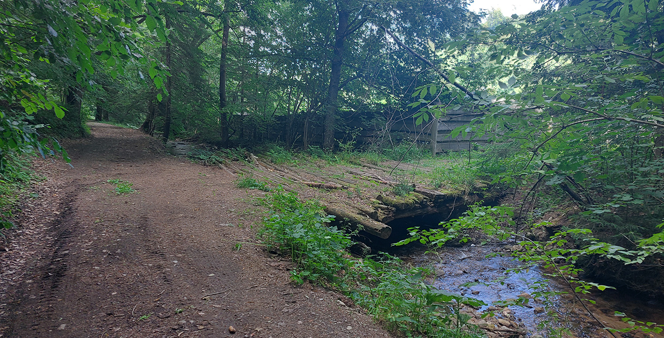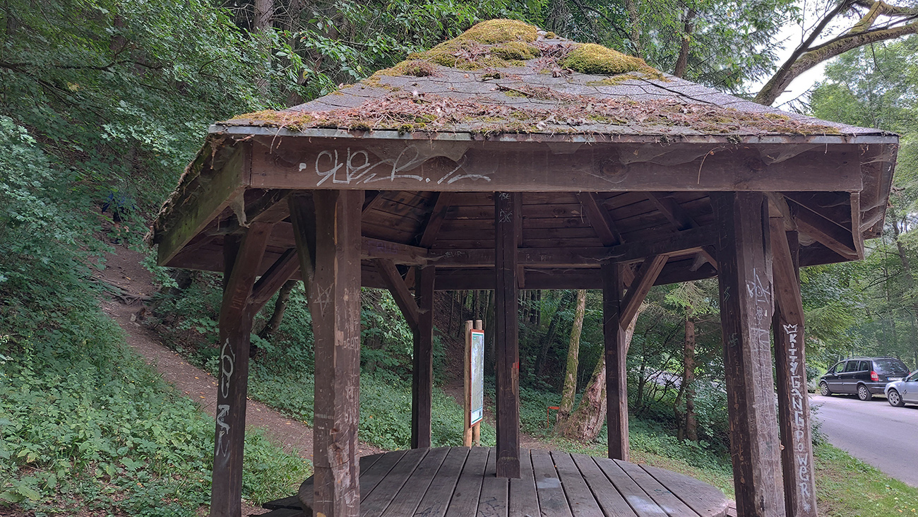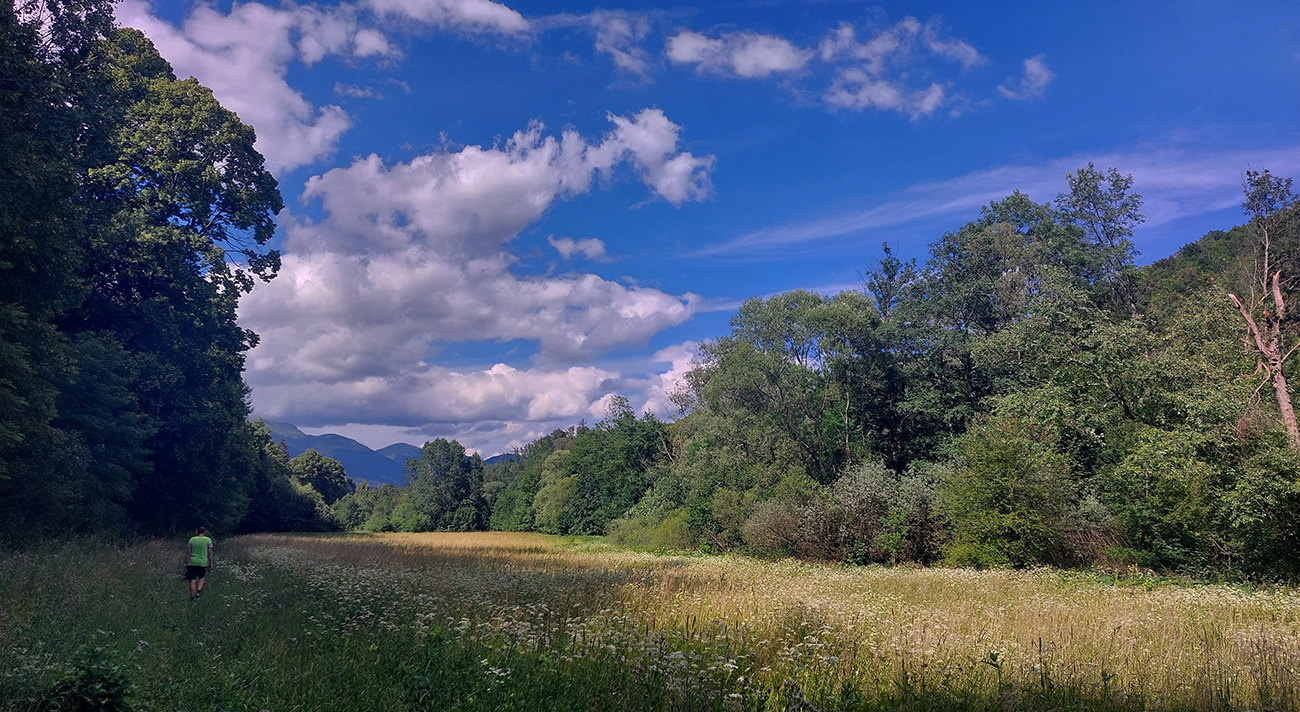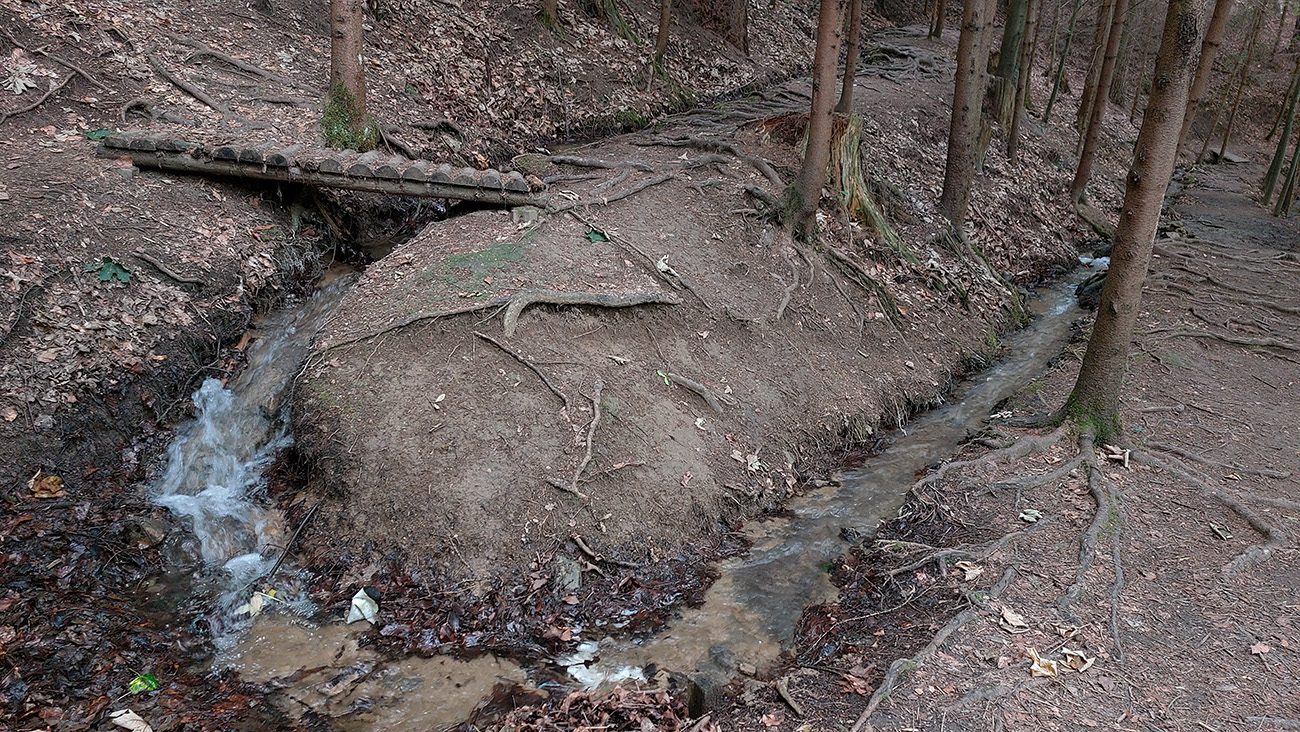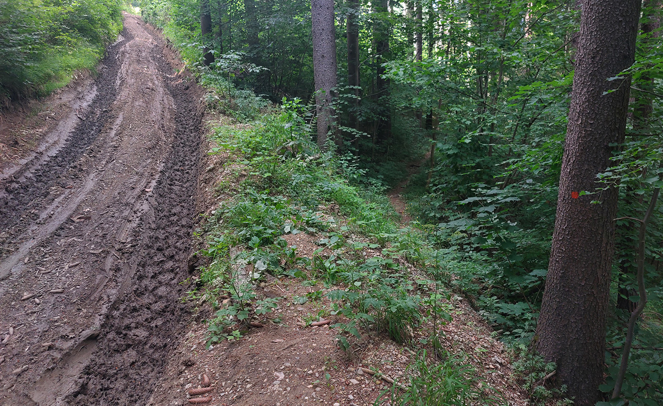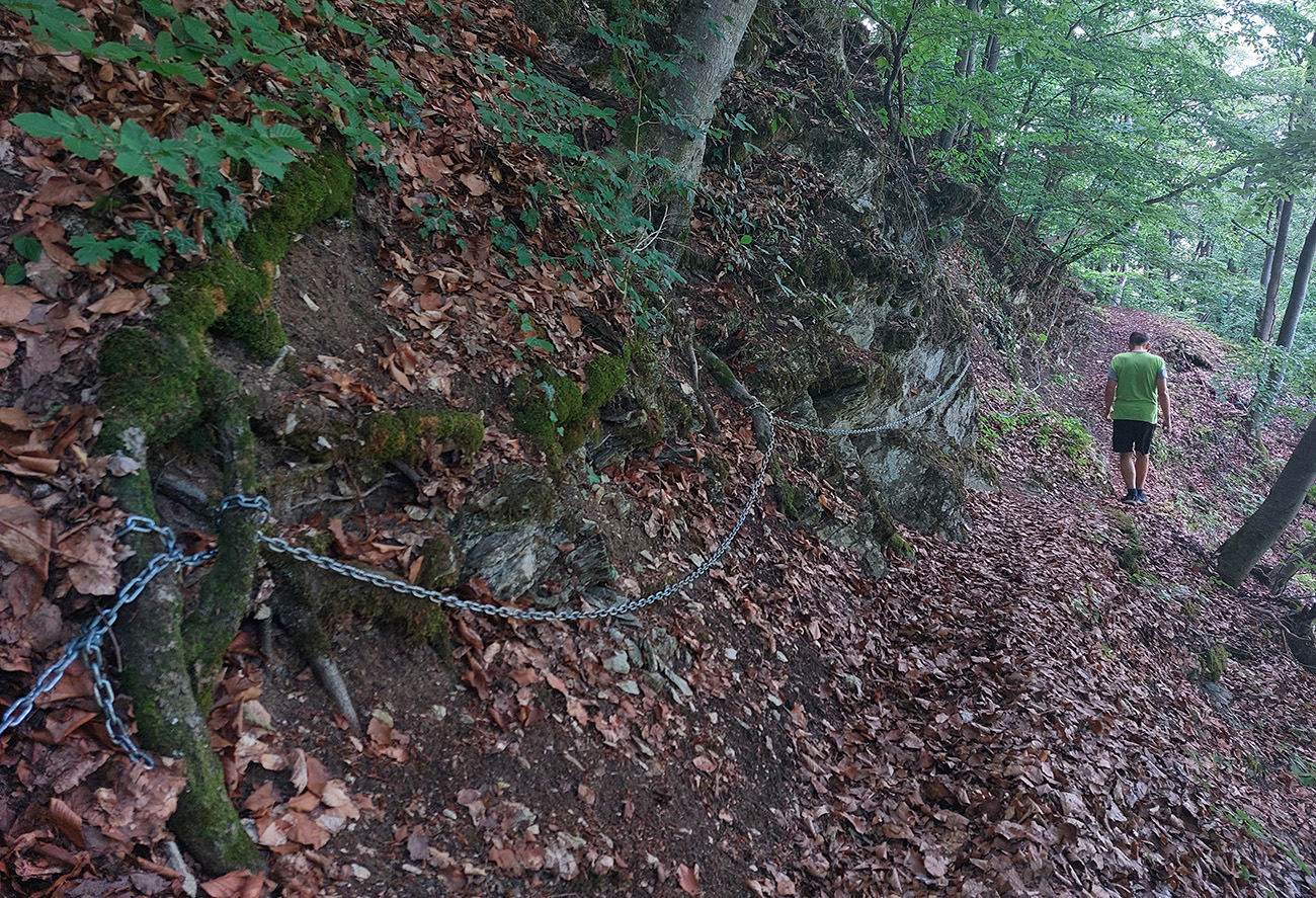 No a posledná časť okruhu je definitívne dole kopcom. Hneď nad hradom rozhranie lesa a lúky zvádza síce k výstupu hore na horizont, ale oranžové štvorčeky a výrazné šípky na strome navigujú doprava, do diery v zelenej hradbe, kade začína príjemný, aj keď úzky, traverzový chodník „Popod lipy“ nazad dole ku minerálke. Miestami je dokonca vylepšený reťazou na pridržanie sa a zvýšenie sebavedomia. Ale dal by sa aj na bajku.