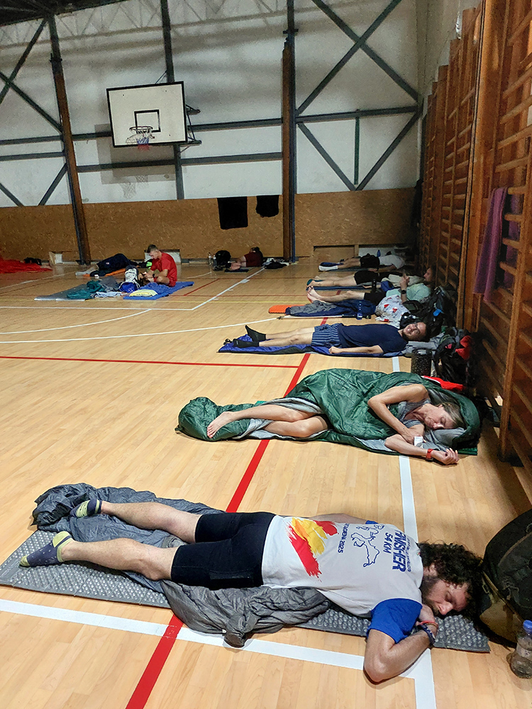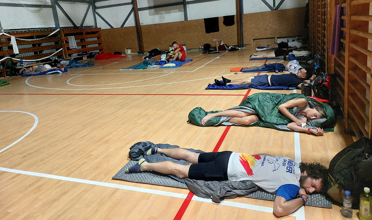 Telocvičňa: šuchotavo a dusno bolo dnu, klasika. Tak sme sa radšej rozbalili na chodbe ďaleko odtiaľ a blízko vchodu, kde fajne previevalo. Chodba úzka, tak usporiadanie „sériové“, v telocvični prevládalo „paralelné“. Dobrú voľbu nám potom potvrdilo pár ľudí, ktorých vraj rušilo nielen šuchotanie a chrápanie, ale dokonca vraj aj súloženie. I tak še da...