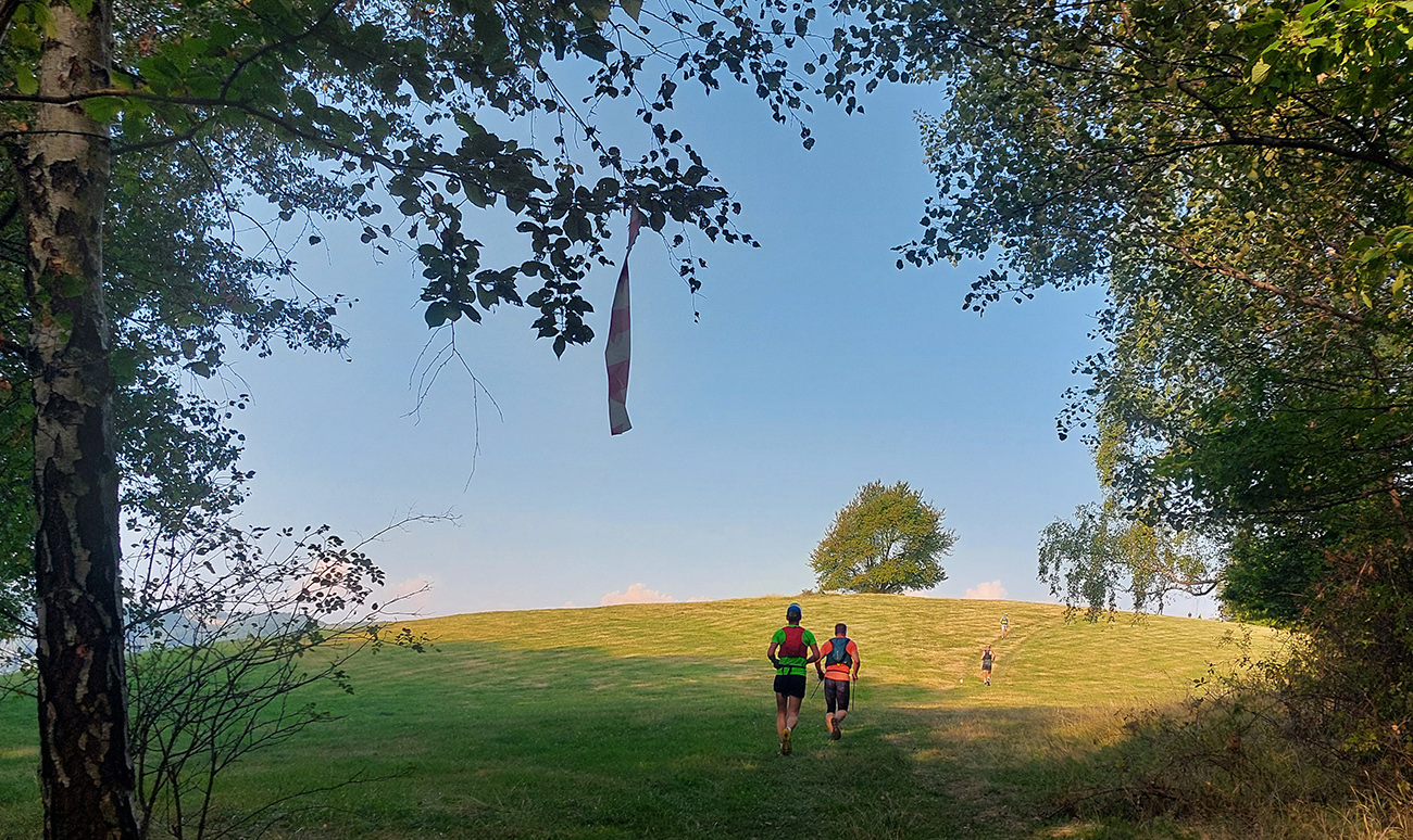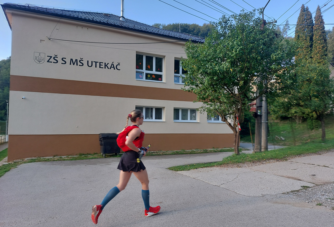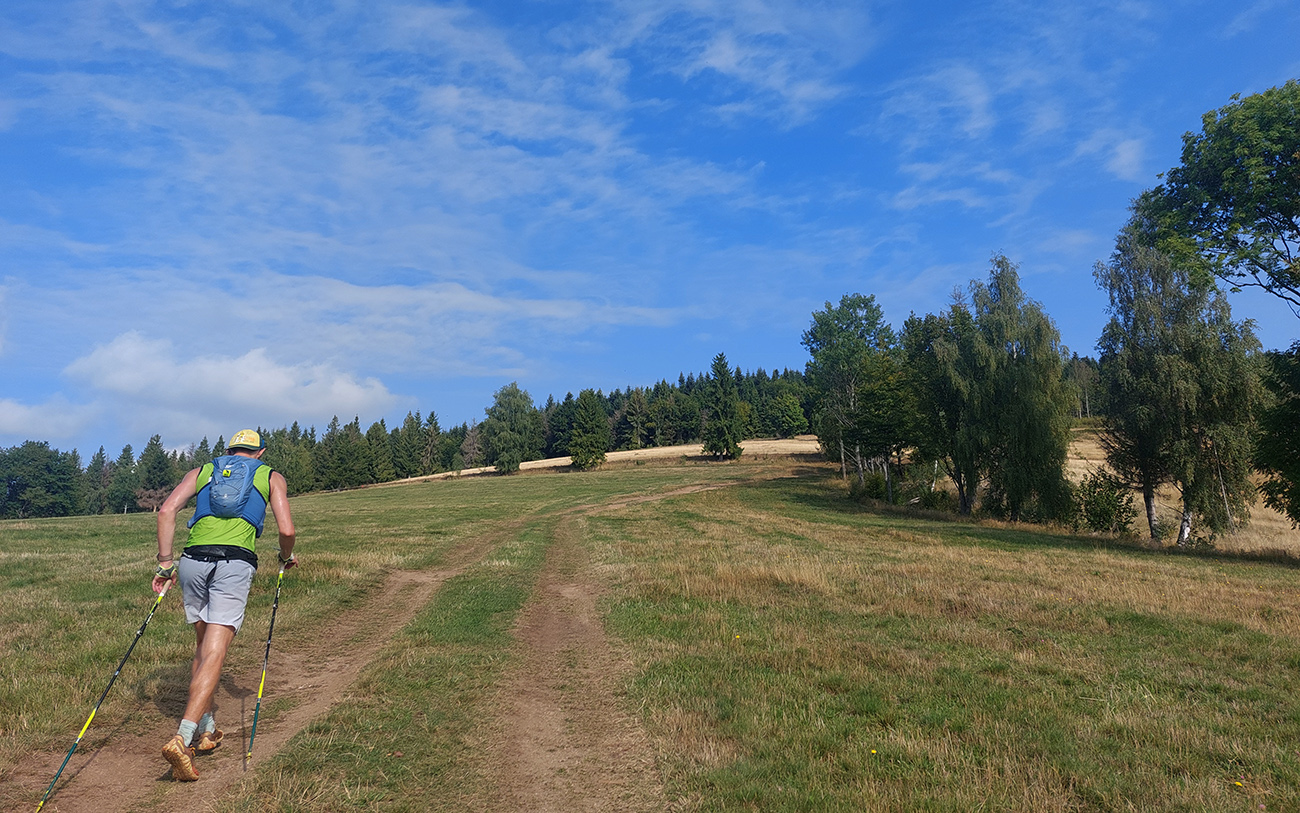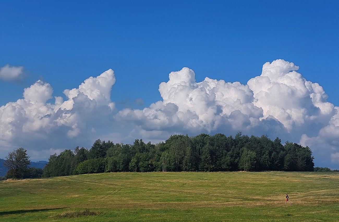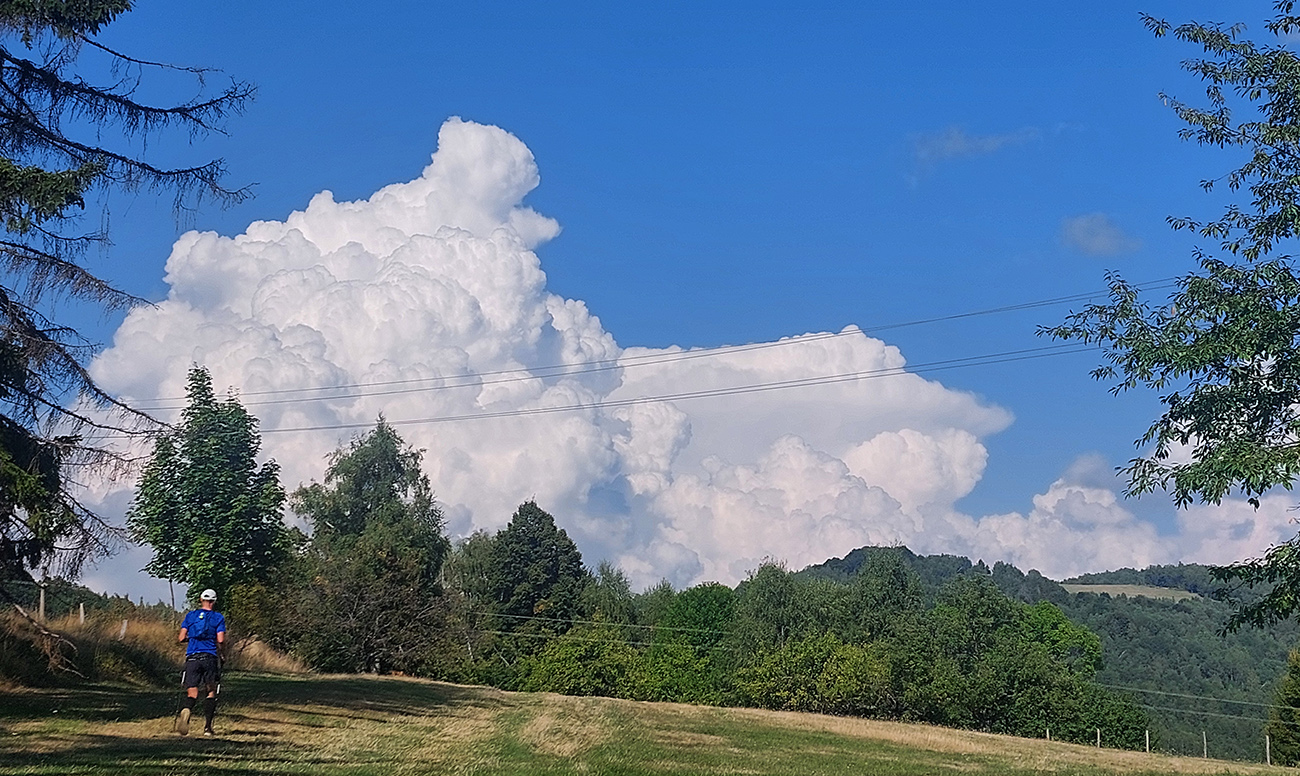 Zahrievací (= infarktový) strmý les na Slopovo k rozhľadni - pod nohami bedle a masliaky, nad hlavou šero. Prečo, to sa ukázalo hore na lúkach – všade naokolo mraky, ešte nízke slnko ukryté za nimi, a aj ten vetrík ovlažoval. Síce bolo trochu lepkavo, ale zatiaľ takmer ideál! Pasiečky s hojdačkou a za ňou rýchlo a zbesilo dole do Utekáča, na K1. Všeeetci mi ušli, lebo už tam som zistil, že do zbehov musím pomaly, že nové topánky držia lepšie ako nedotrénované nohy. Aj prvé ženy v nedohľadne, to zas bude rana pre moje ego...