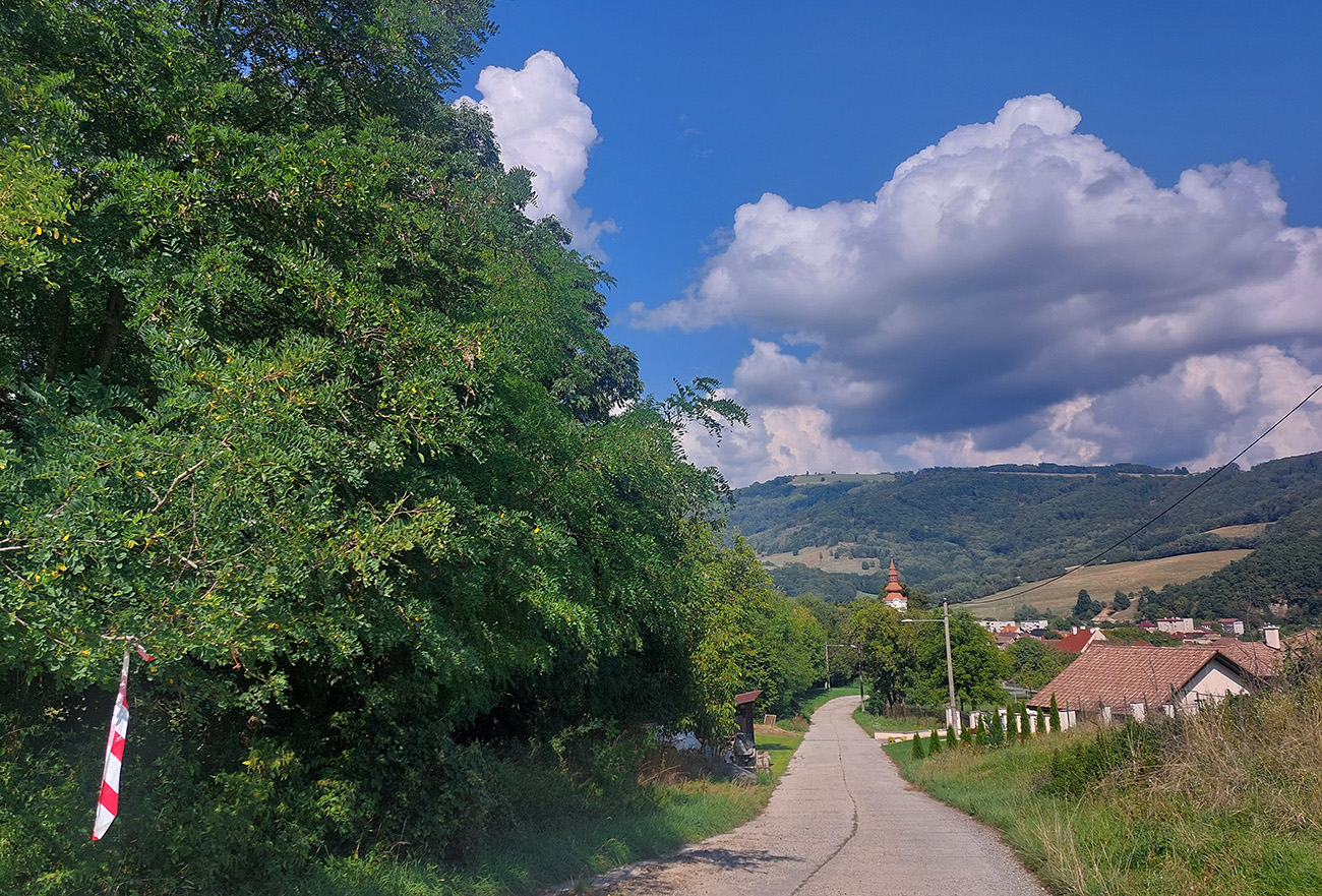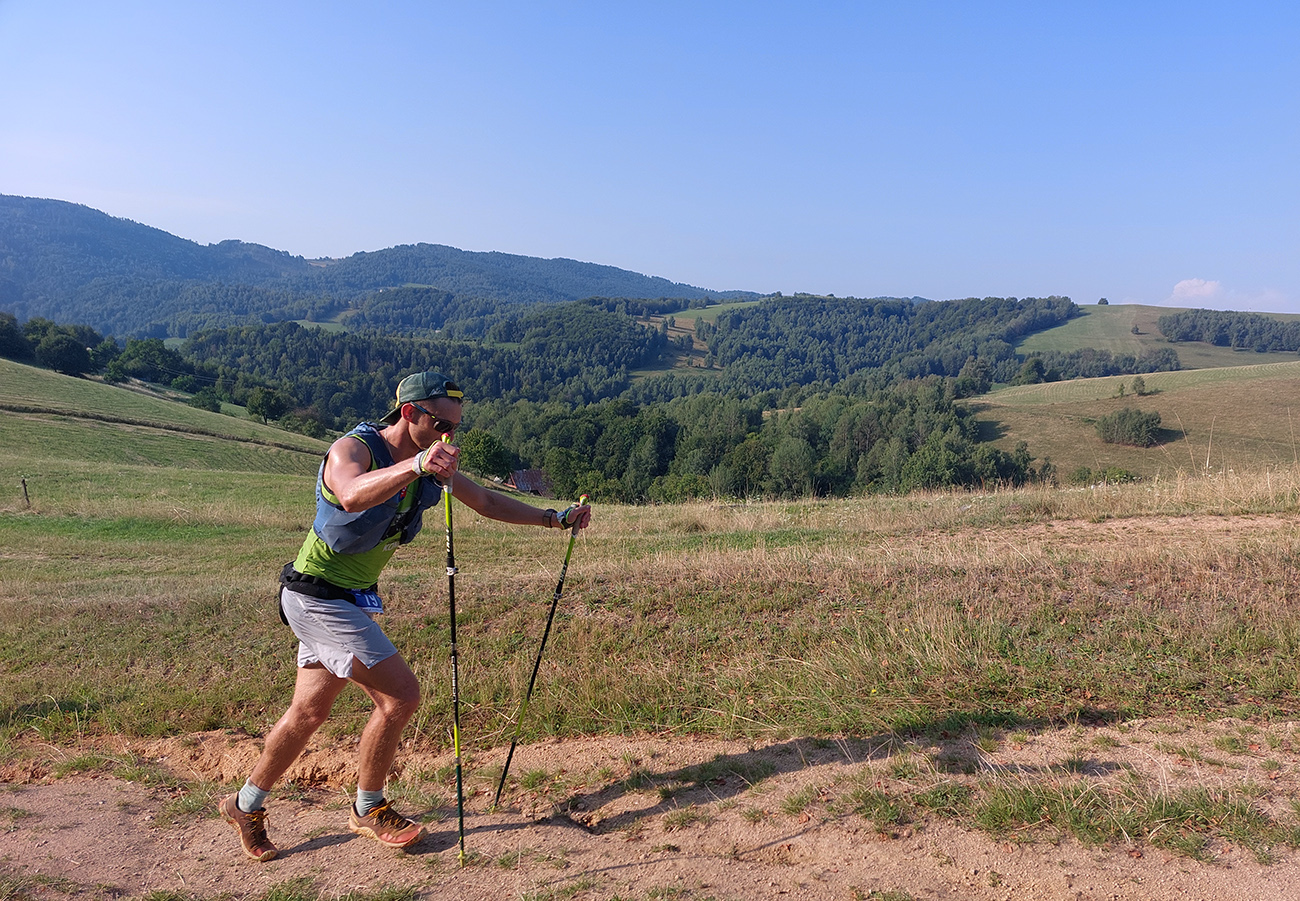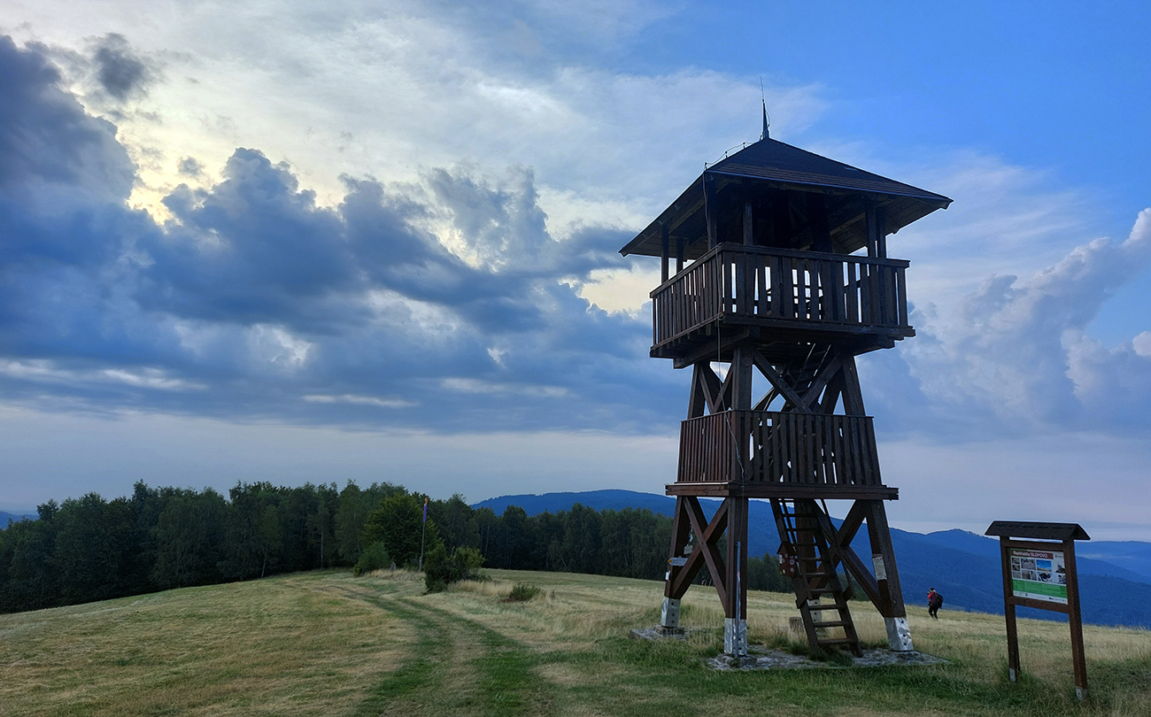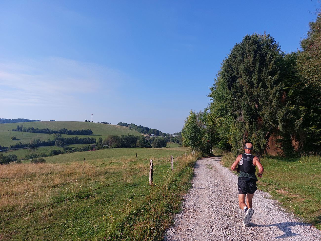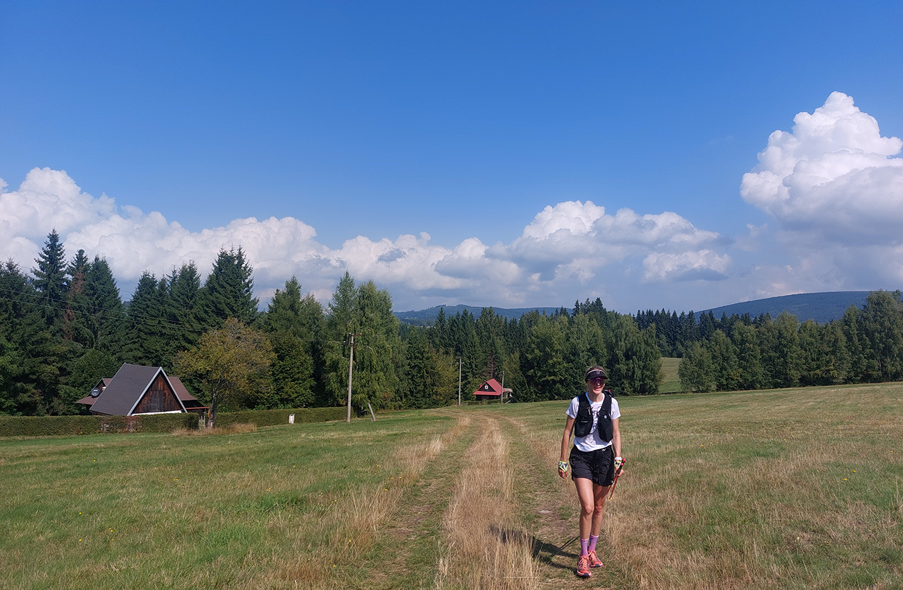 Zahrievací (= infarktový) strmý les na Slopovo k rozhľadni - pod nohami bedle a masliaky, nad hlavou šero. Prečo, to sa ukázalo hore na lúkach – všade naokolo mraky, ešte nízke slnko ukryté za nimi, a aj ten vetrík ovlažoval. Síce bolo trochu lepkavo, ale zatiaľ takmer ideál! Pasiečky s hojdačkou a za ňou rýchlo a zbesilo dole do Utekáča, na K1. Všeeetci mi ušli, lebo už tam som zistil, že do zbehov musím pomaly, že nové topánky držia lepšie ako nedotrénované nohy. Aj prvé ženy v nedohľadne, to zas bude rana pre moje ego...