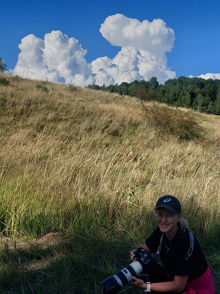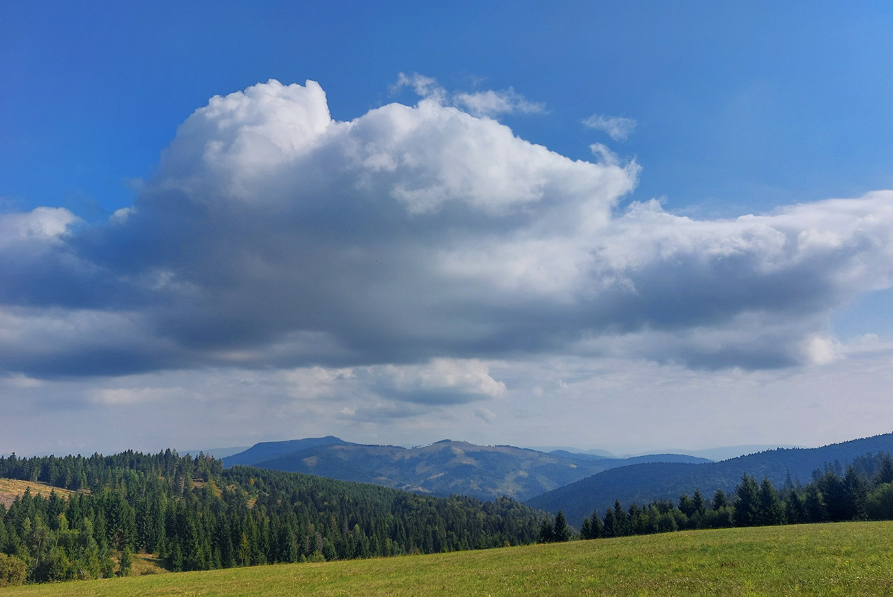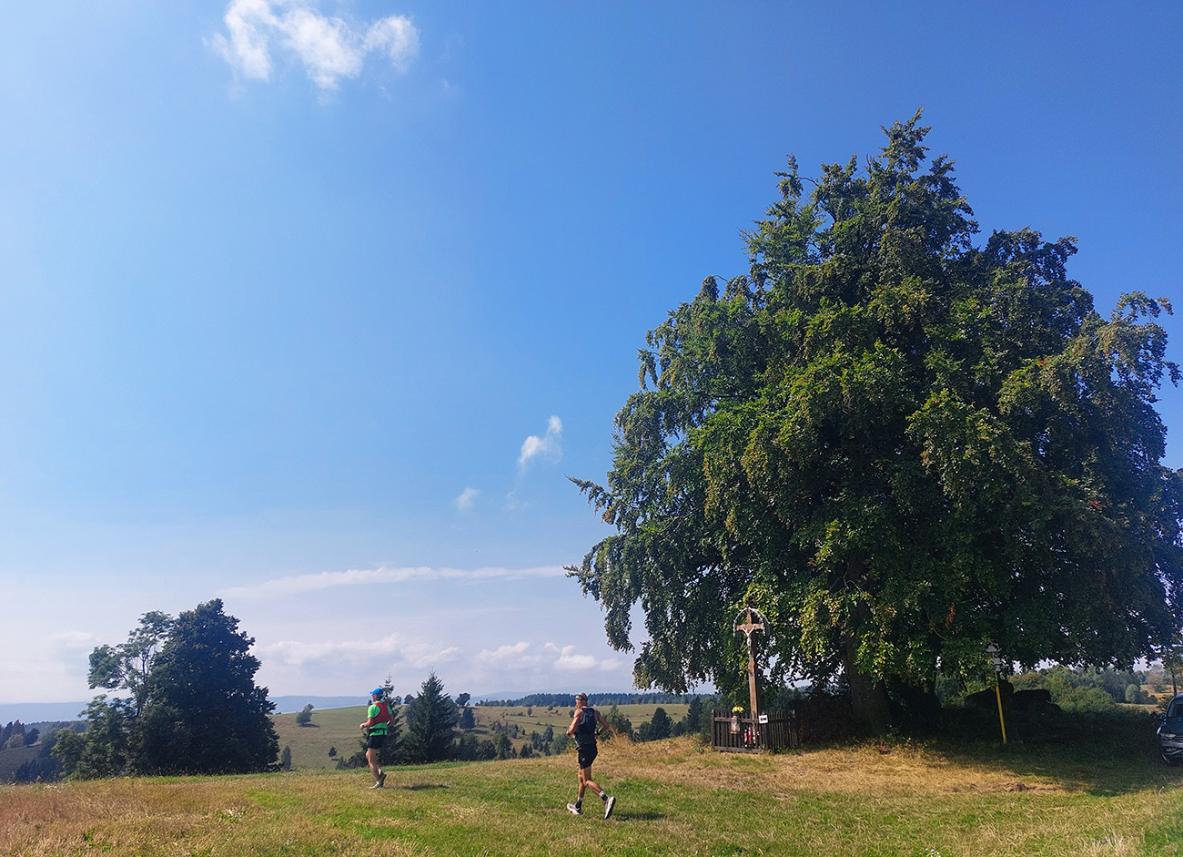 Ale potoooom! Z lesného vlhka na slnečné lúky. Úsek po K2 pri penzióne Family, to boli strašné provokácie – mraky samozrejme všade dookola na horizontoch, len tam, kde stálo slnko, žiadny. Nad hlavami modro. Sucho ako v savane, ale cestou sú Čertove potôčky a Močiar. Aspoň muchy ešte neotravovali, odfukoval ich fajný, jemný severáčik. Tie ďaleké výhľady a krásna, guľatá pasienkárska krajina naokolo ako bonus. Asi preto tam fotografi striehli za každým kríkom. Len nohy už vädli, veď ako inak po 15 kilákoch. Už by im aj stačilo.