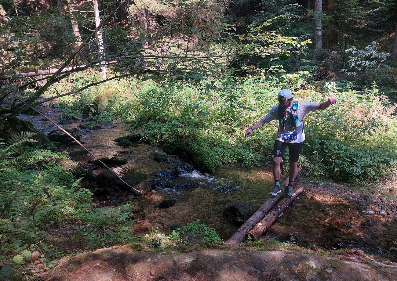 Bratkovica – sakra aké nové haciendy! Ale hlavne ďalší poriadny krmelec. Tento raz však celý deň nič pevné do brucha – len to, v čom je veľa vody, cukru a solí. Takže dyňa, pomaranč, z vlastných zásob gel. Do fľaše jonťák a rýchlo preč! No dobre, pomaly preč... Zase lúky, lesy, občas výhľady na Bykovo vľavo, potom na kravíny vpravo. Ešte nekonečné šotoliny miestnych ciest a strmý zošup k potoku Smolná, bez ktorého síce ešte žiadna H100 a KT nebola, ale ktorý napriek tomu vizuálne vôbec nepasuje do obrazu miestnej krajiny. Ako pri preskakovaní tatranskej bystriny sa tam človek cíti. A samozrejme je to obľúbený fotobod pre škodoradostných paparazziov – či a niekto vykúpe. Tentokrát sa vykúpal minimálne jeden účastník, no dobrovoľne.