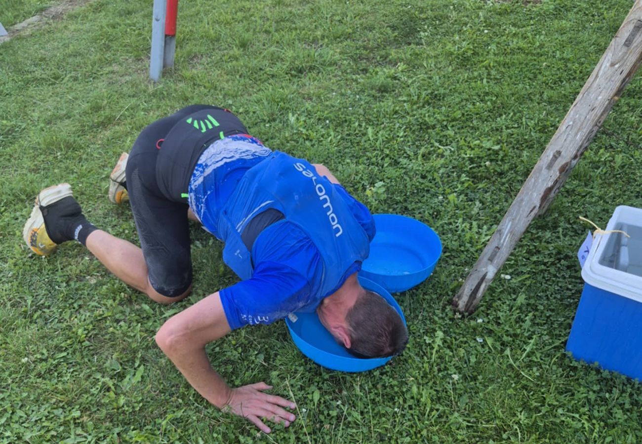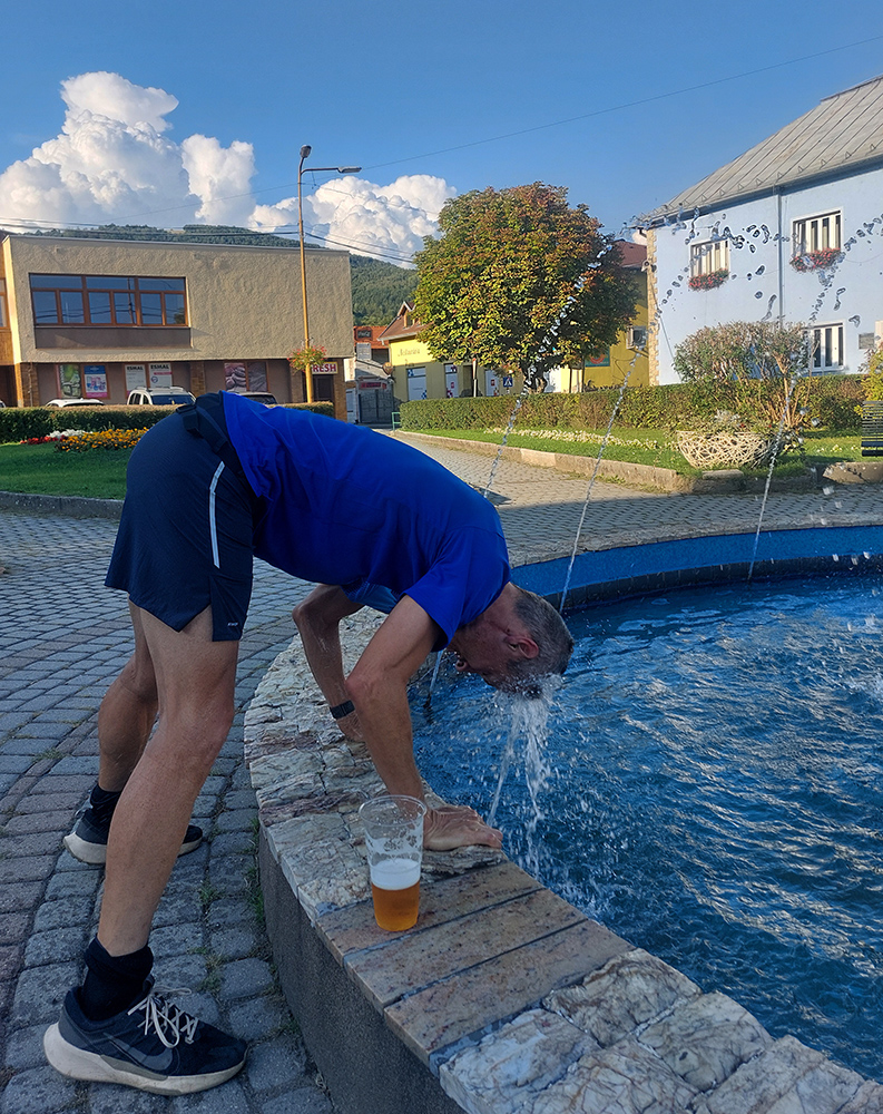 Tam, keď som videl na zemi misky s vodou, dosť hlboké, aby som do jednej strčil hlavu, som šiel hneď „na moslima“ a vôbec ma netrápilo, či som otočený správne smerom k Mekke. Ani to, že to vraj boli napájadlá pre psov. Hneď sa lepšie stúpalo z jamy ďubákovskej. Celkovo tá „cieľová rovinka“ bola taká milosrdnejšia. Vietor lepší, nižšie slnko za chrbtom a v nekonečnom klesaní z posledného kopca Dielu sa mi už na furt skrylo za obzor a stromy. Smotanové bizóny za ohradníkmi pekne ladili so šľahačkovými horami na obzore. Zostup do sauny č.2 bol už okolo piatej predsa len v ľudskejšej teplote. Niektorí sme aj tak viac vnímali cieľovú fontánu ako cieľovú bránu.