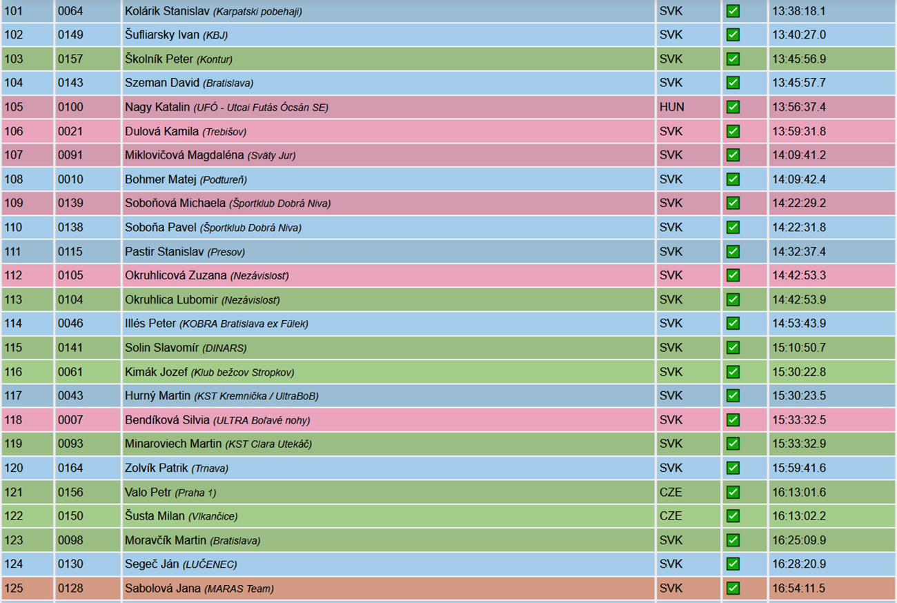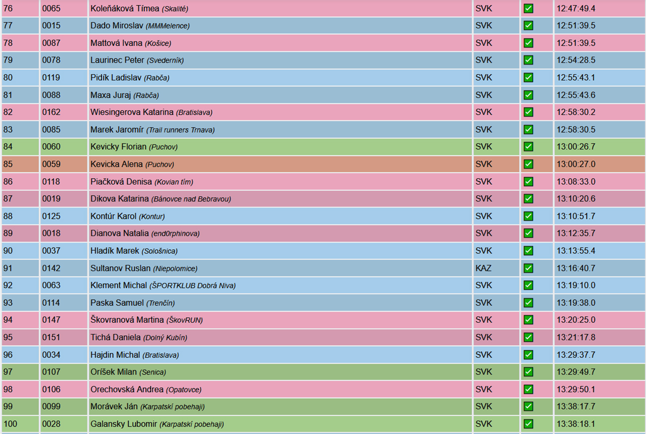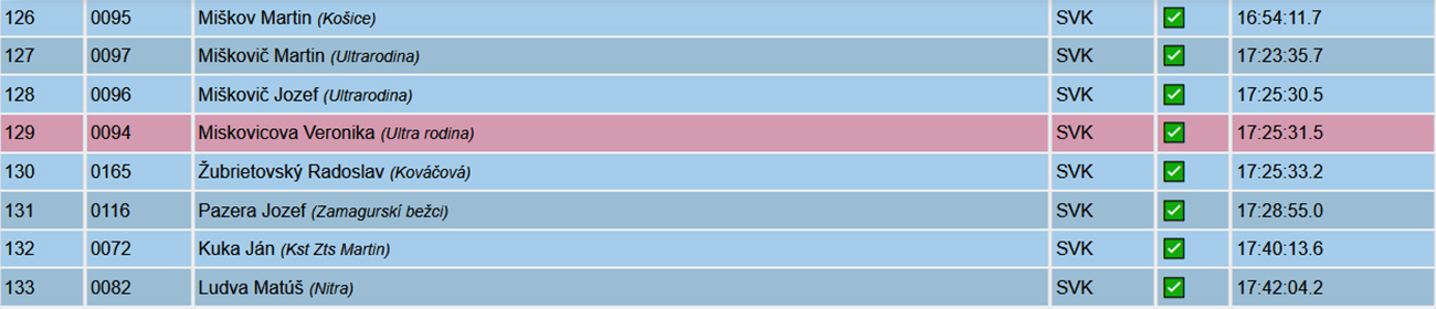Od potoka hore na Táňovo mi trochu odľahlo, lebo aj do mierneho kopca už takmer všetci naokolo kráčali, nehanbil som sa až tak a bolo viac času zaostrovať. Na Táňove, na K4, tam to prišlo – nekompromisná deva za prázdnym stolíkom, niečo ako nemecká colníčka pred naším vstupom do schengenu. Ukáž výbavu!!! Niektorí s odkrveným a uvareným mozgom síce už – už začali siahať na nesprávne miesta, no deva tam našťastie mala ochranku. Lenže ona nielen obzerala, kto čo nemá, ona za to aj rozdávala DSQ! A dostal ho hneď vedúci mimozemšťan Tomáš Kubičík a po ňom 12 ďalších ultrášov. Deva naša zlatá, takto si ty veru chlapa nenájdeš – zadrel vraj nemenovaný klasik pri tom akte. Hlavne ale už nič nestálo v ceste k návratu legendy – Majo Priadka v cieli jediný pod osem hodín, komfortne pred Petrom Matejom a Milanom Toldom.