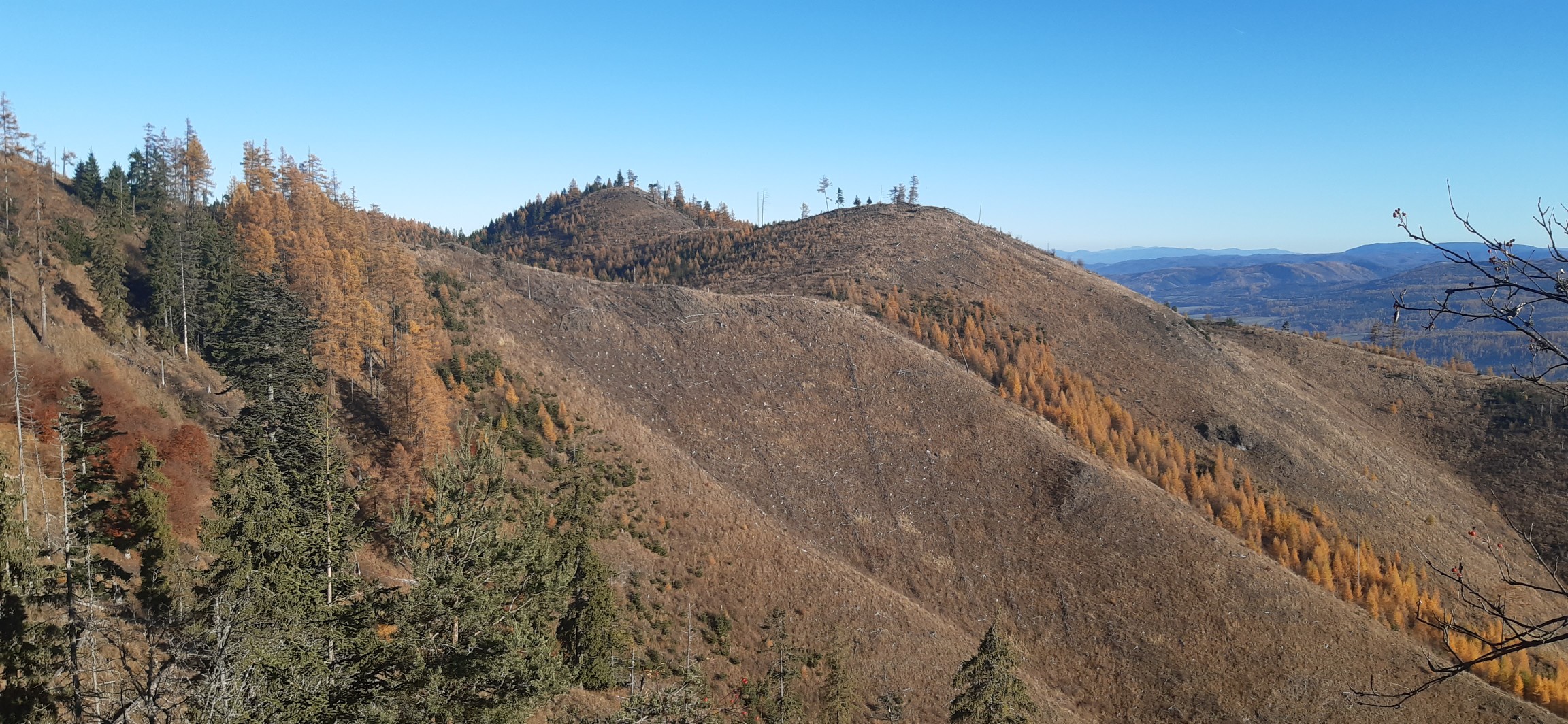 Výstup na vrchol pokračuje strmým priesekom vo zvyšku lesa na vrcholový hrebeň. Už tu sa nám otvorí nádherný výhľad na Tatry. Vysoké aj Nízke. Tie pohľady smerujúce bližšie a nižšie už také nádherné nie sú... ale je potrebné si uvedomiť, že priority tejto oblasti nie sú v turizme (: