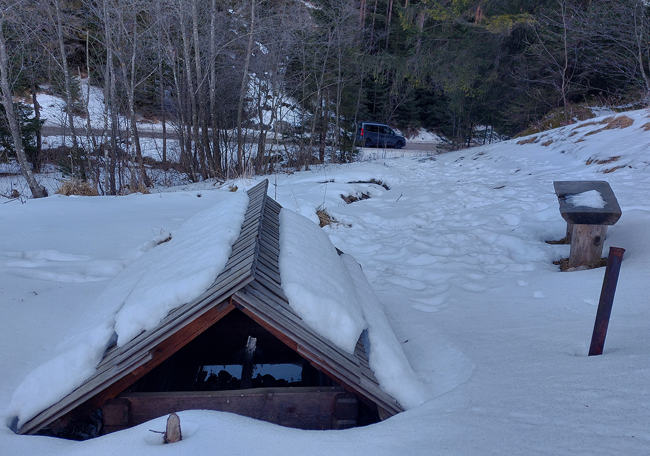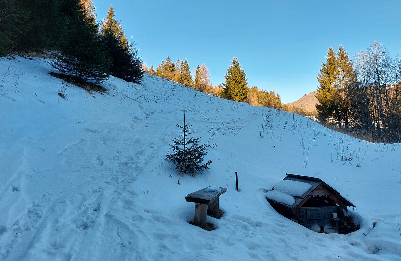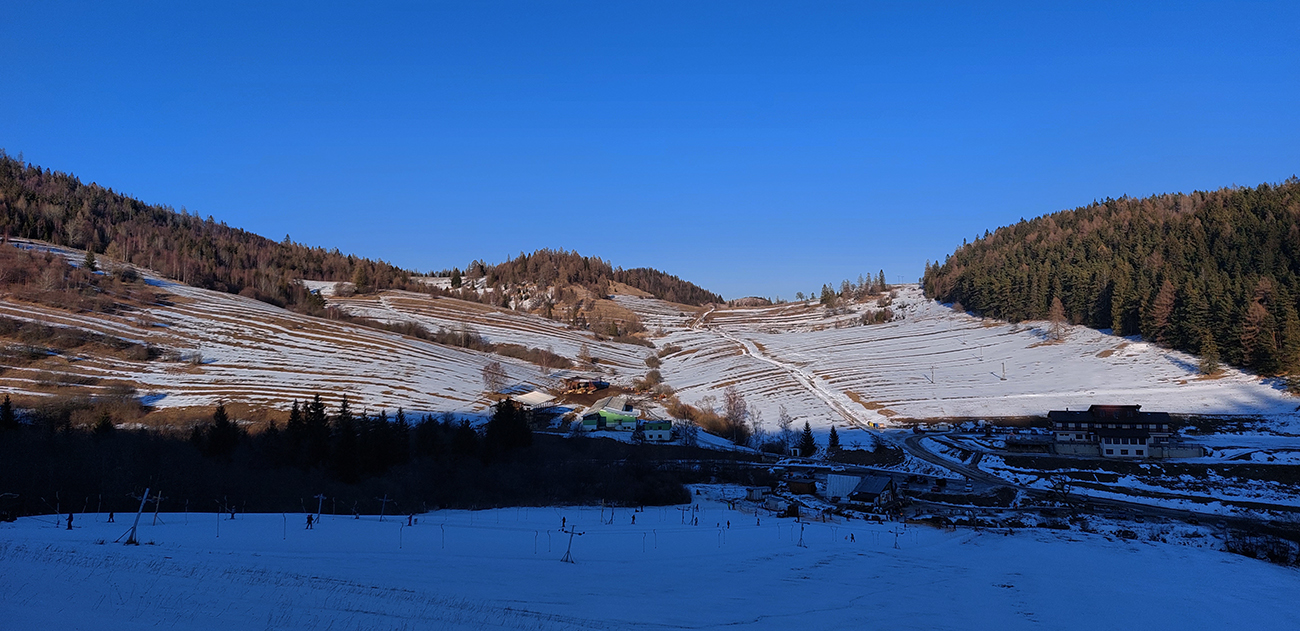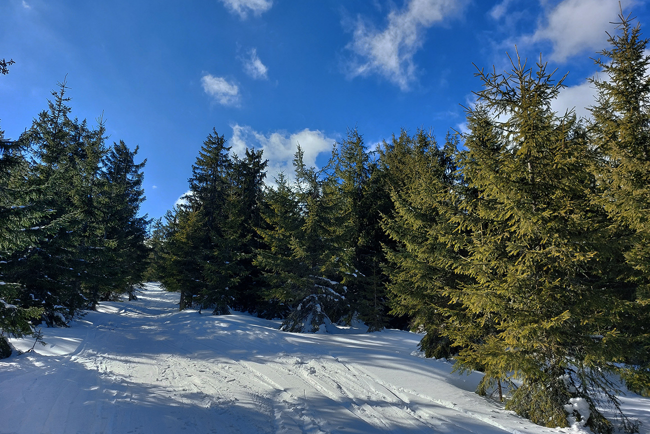 Našťastie až ku vlekom po ceste nemusím: malý mostík cez potok ku studničke a od nej už sa dá pomedzi krtince a trávu aj na pásoch, dokonca aj stopa je! Podklad: aprílový firn, hlboko zmrazený do tenkej kôrky na vrchu a sypkej plnky s bylinnou prímesou pod ňou. Dnes (sobota 12.2.) aspoň že teplota nemá vyliezť nad nulu, tak dúfam, že sem aj zlyžujem. Pod vlekmi ľadový menčester, v prudších pasážach zjazdovky musím poriadne potiahnuť rukami. Vstup do lesa: stopa široká, vyleštená brzdením, ale špinavá od konárikov a šišiek, občas hlinu vidno. Ešte sa pýtam vlekára, či prejdem bez vyzúvania. Nevie.