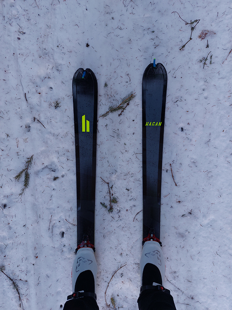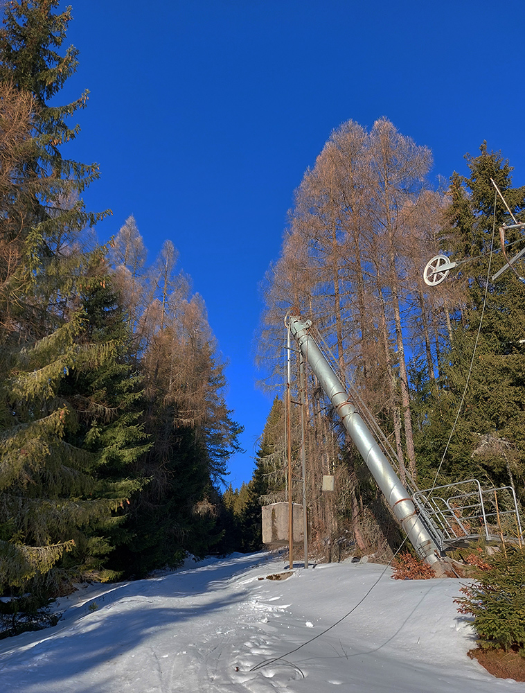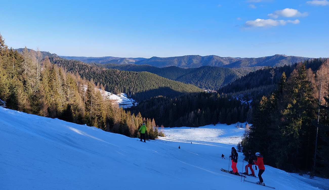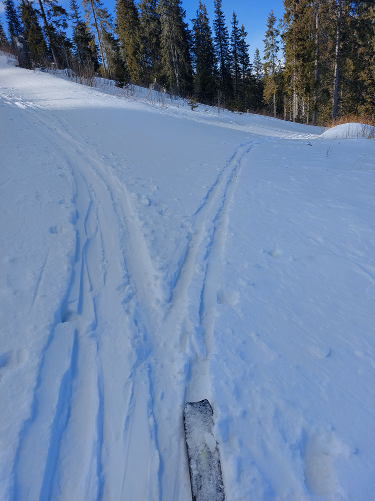 Našťastie až ku vlekom po ceste nemusím: malý mostík cez potok ku studničke a od nej už sa dá pomedzi krtince a trávu aj na pásoch, dokonca aj stopa je! Podklad: aprílový firn, hlboko zmrazený do tenkej kôrky na vrchu a sypkej plnky s bylinnou prímesou pod ňou. Dnes (sobota 12.2.) aspoň že teplota nemá vyliezť nad nulu, tak dúfam, že sem aj zlyžujem. Pod vlekmi ľadový menčester, v prudších pasážach zjazdovky musím poriadne potiahnuť rukami. Vstup do lesa: stopa široká, vyleštená brzdením, ale špinavá od konárikov a šišiek, občas hlinu vidno. Ešte sa pýtam vlekára, či prejdem bez vyzúvania. Nevie.