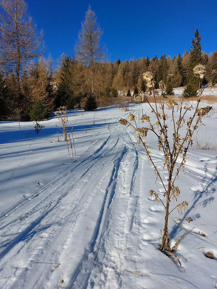 Prešiel som, aj keď stačí jeden, dva dni tepla a nebude sa dať. Prvá lúka nad tým lesíkom, to je kľučkovanie pomedzi kriaky a bodliaky a trávu, ale našťastie takmer súvislá biela vrstva, stále betónový firn. Strmšia pasáž popri lese, to budú smerom dole poriadne krátke oblúky, bude si treba pomôcť miestami aj po rúbanisku povedľa. Sem tam to podšmykne na ľade. Zato za druhým lesíkom konečne mi pod pásmi začína vŕzgať normálny, aj keď dobre premrznutý sneh. Aj buriny ubudlo, tu už zjavne kosia či pasú.