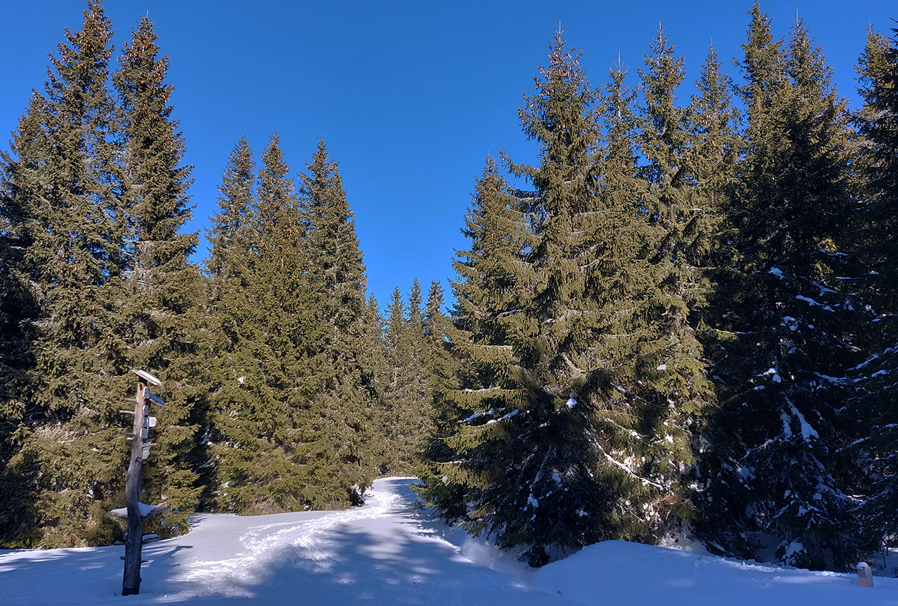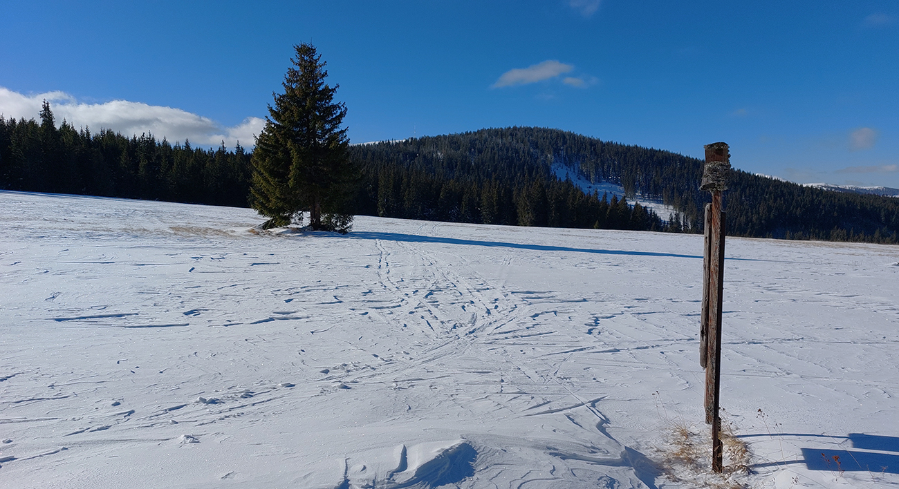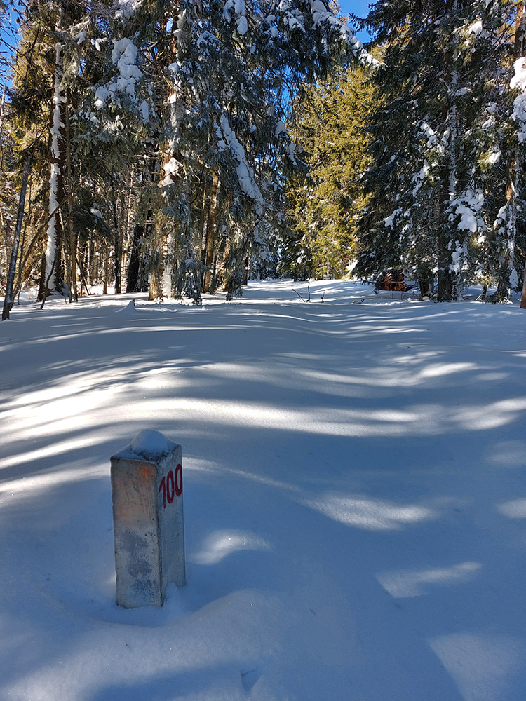 Za smerovníkom Smrečinského sedla začína najväčšia sranda dňa: stopa síce preleštená, ale odbočuje od modrej značky kamsi doľava dole a na značke len súvislé lesné bielo. Neznalý miestnych pomerov si myslím, že to niekto predo mnou sa zamotával, tak prerážam stopu poslušne po modrej. Aj tu sa párkrát zamotávam, keď značky nevidieť, alebo keď ma zlákajú takéto betónové „kilometrovníky“: