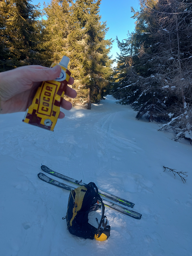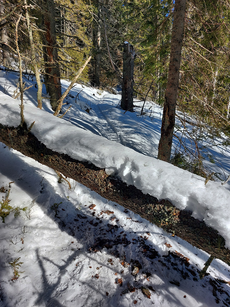 Od Martalúzky k neznačenému traverzu (ktorý som smerom hore neznalo obišiel) už je stopa poriadne načatá pešiakmi, ale lyže z jamy sa mi vyniesť darí, moc sa neborím. A aj keď treba miestami trochu postromčekovať alebo potlačiť rukami, dá sa. Pásy lepím až v tých rúbaniach s výhľadom ku Kojšovke, potom ale nasleduje poriadne kľučkovanie a podliezanie vývratiskom. Miestami ani podliezť, ani obísť. Ale sranda, snehu zatiaľ jesto – len dokedy vydrží? Je to tu na juhovýchodnom svahu dosť otvorené.