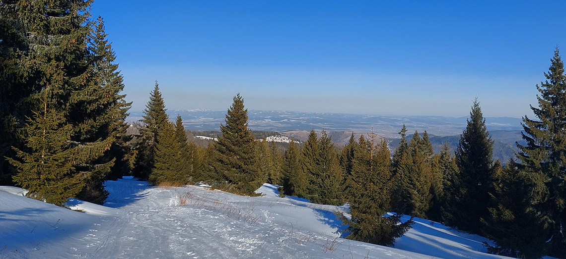 V strmšom zostupe z Úplazu potom neskôr síce stopu pod nohami miestami aj vidím, ale pešiu a poriadne zaviatu, kľučkuje pre lyže až neprijateľne. Na mape ale od začiatku tejto "srandy" registrujem neznačený traverzový chodník trochu nižšie vo svahu, tak sa napájam a to je tá preleštená stopa - tak mi dochádza, že miestni znalci v zime tento úsek traverzujú. Aj smer dobrý, vpredu zase cez rúbanisko svieti Hoľa. Doľava, na východ, vidno do diaľky Volovských vrchov, neviem, či správne identifikujem Kojšovskú hoľu. V poslednom strmšom, užšom prechode cez les aj stromy zrazu vyzerajú ako v zime, krásne olepené snehom.
