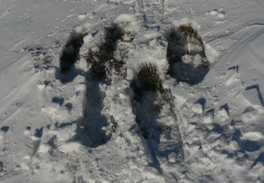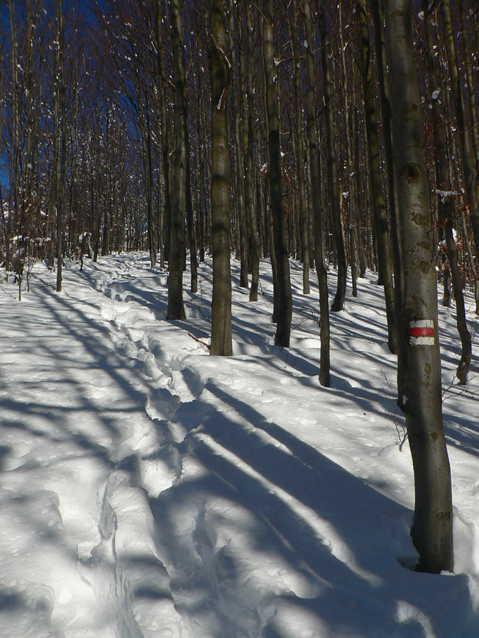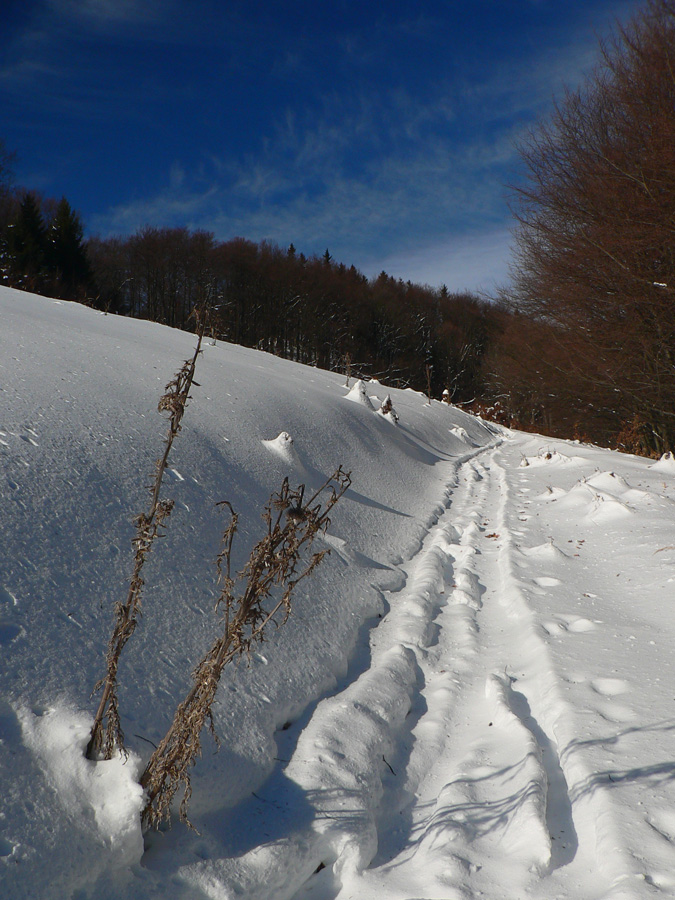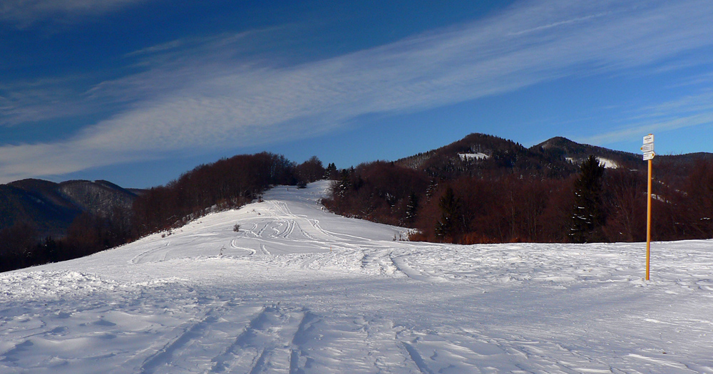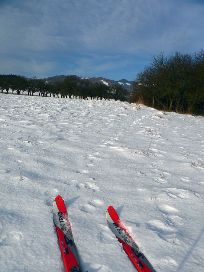 Z lesa som definitívne vyšiel pod Veterným a tam aj keď ako zázrakom nefúkalo, snehu po posledných vetroch veľa neostalo - čučoriedky trčali, nad nimi sa kôrka prepadávala. Ale stopa bola a v nej sa dalo.