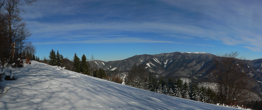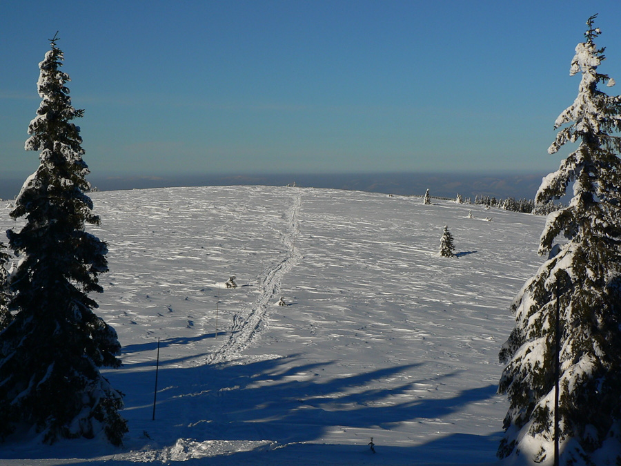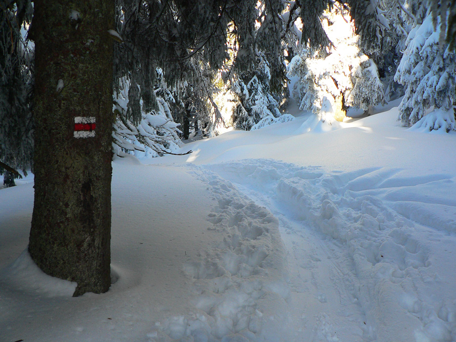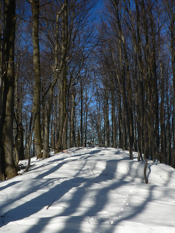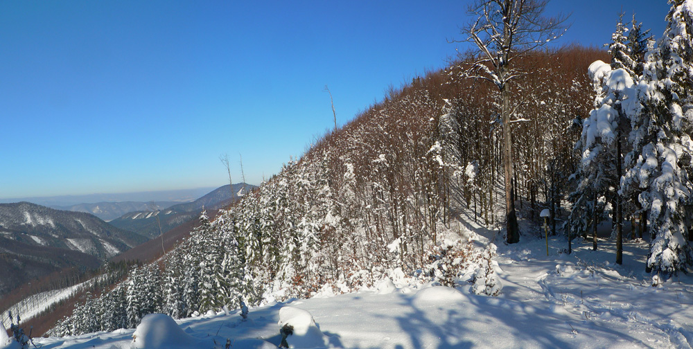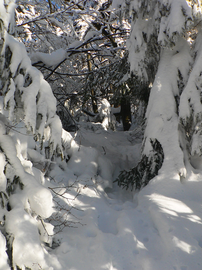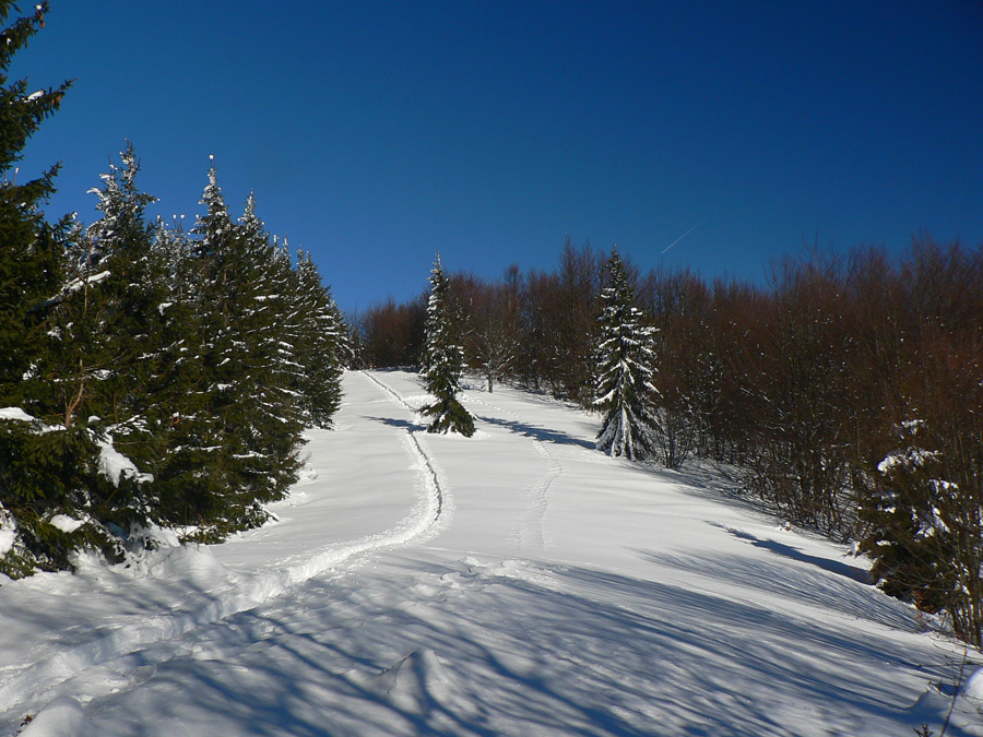 Na Kýčere azúro, vietor napriek výstrahe sa ani nepohol. Na sever aj na juh panenský sneh, ide sa naťahovať stopa. A už aj naťahujem – najprv prudko dole z kopca. Miestami záveje, miestami tvrdá kôra, miestami vyfúkané až na hlinu. Do toho konáre ako naschvál vo výške očí :-)