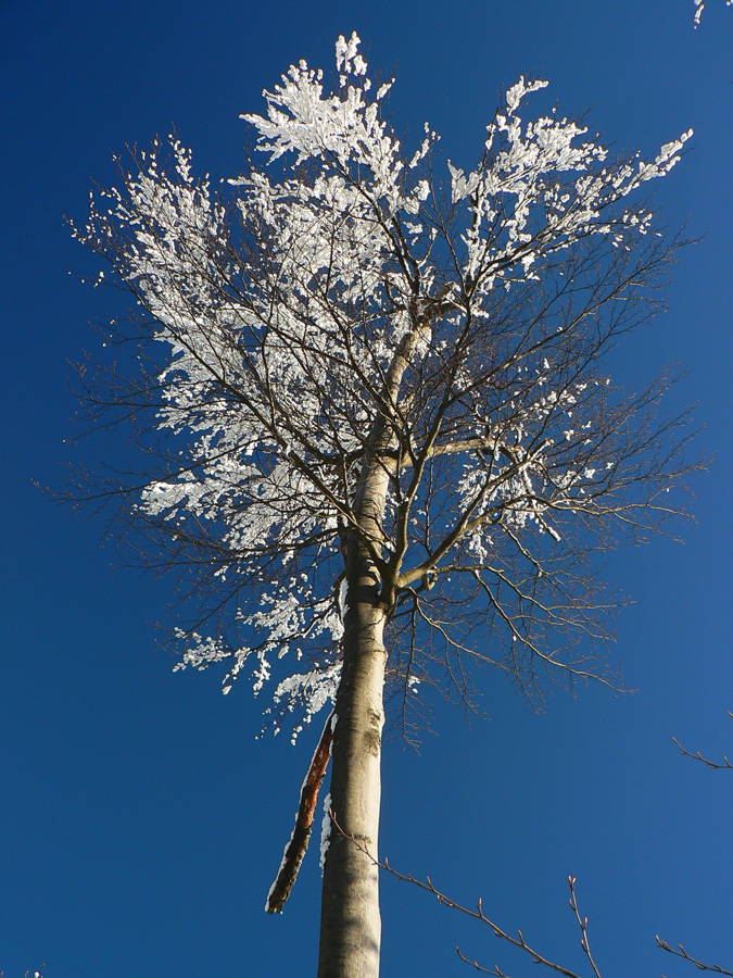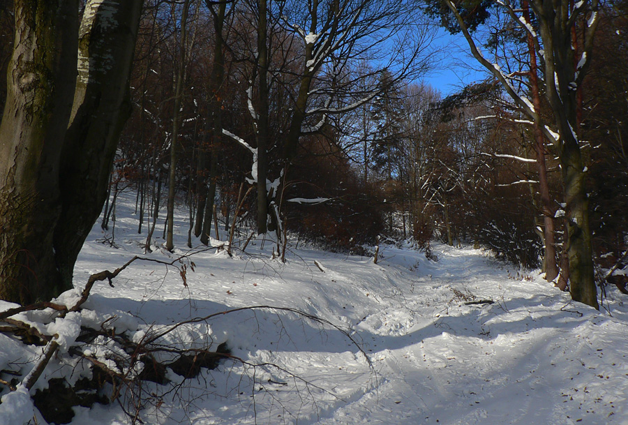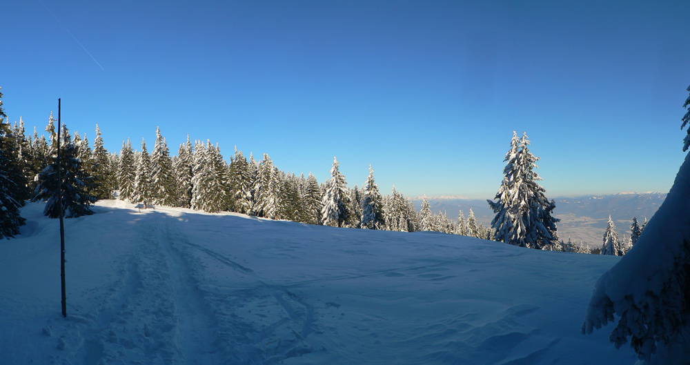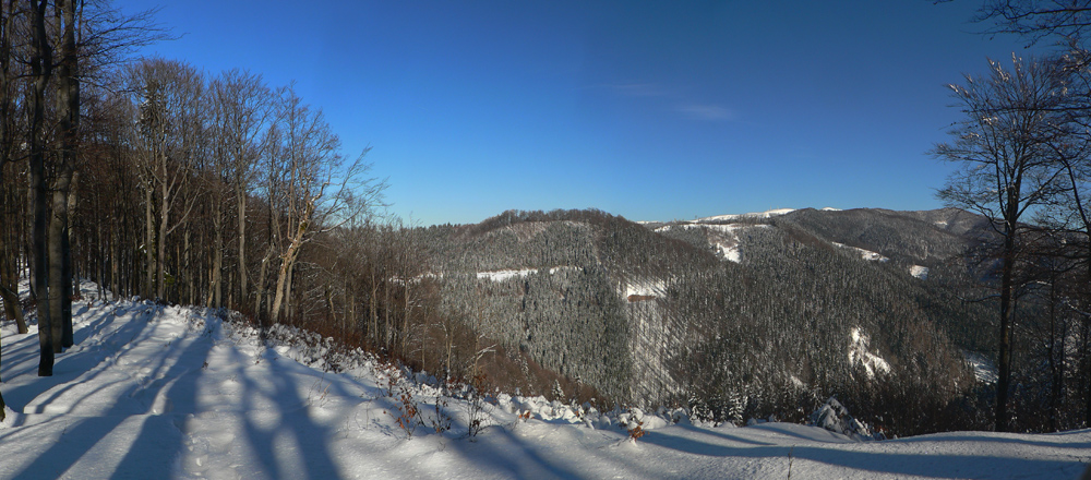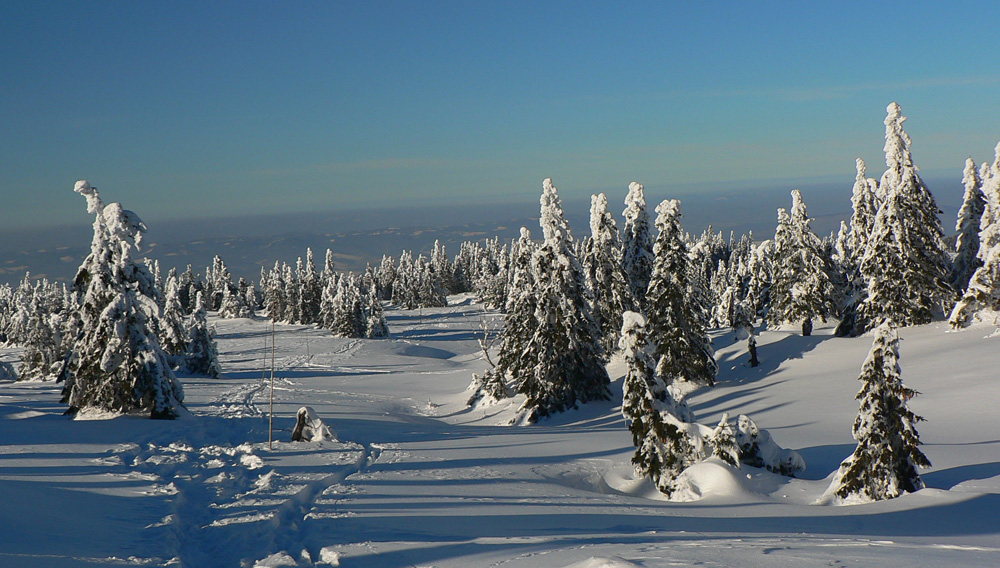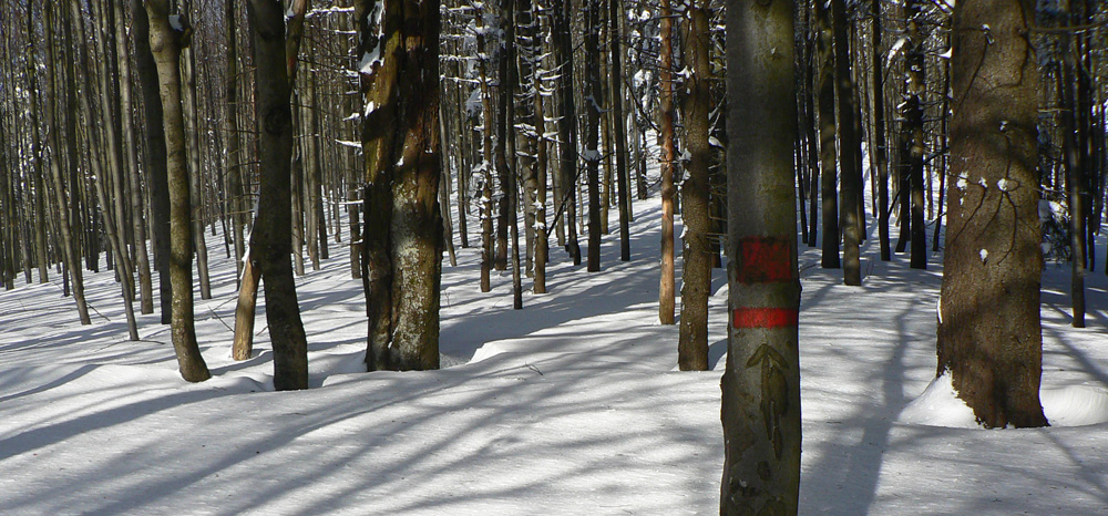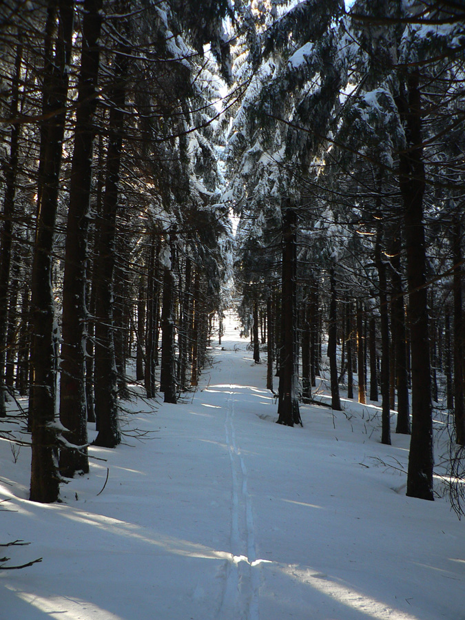 Na Kýčere azúro, vietor napriek výstrahe sa ani nepohol. Na sever aj na juh panenský sneh, ide sa naťahovať stopa. A už aj naťahujem – najprv prudko dole z kopca. Miestami záveje, miestami tvrdá kôra, miestami vyfúkané až na hlinu. Do toho konáre ako naschvál vo výške očí :-)