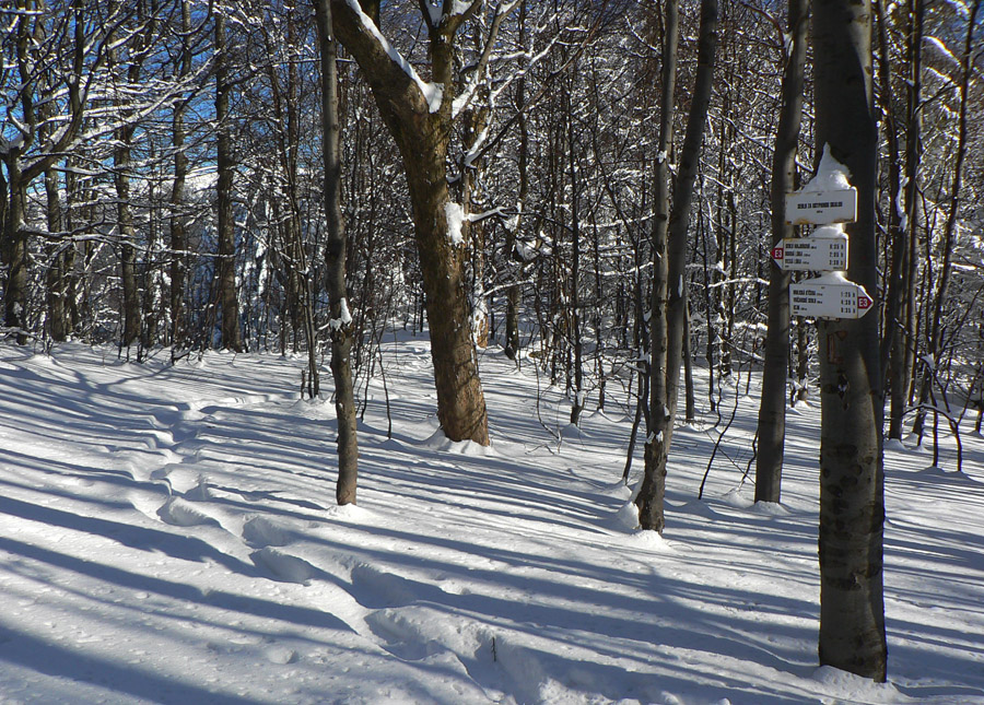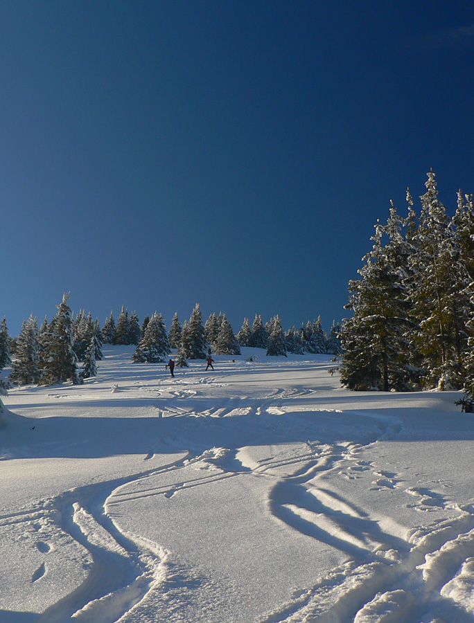 Pohoda len na chvíľu, po sedlo Majbíková. Tam sa sprava pripojili v mojom smere čerstvé stopy po snežniciach a o chvíľu som stretol v protismere štvorčlennú partiu. Tiež na snežniciach. A bolo po kĺzaní, ďalej ako na tankodrome :-) Ale jasné že nevadí, tu nejde o rýchlosť, ale o radosť!