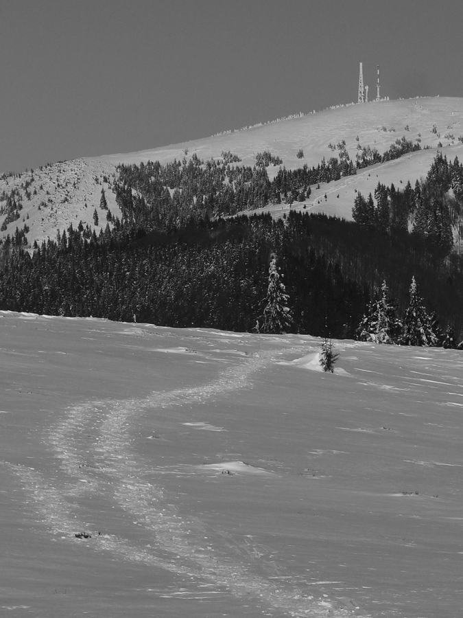Od lanovky na Kýčeru bolo vidno starú stopu – čím vyššie, tým viac zapadnutú. Čím vyššie, tým viac som prerážal novú. Vietor sa na hrebienku vyblbol, narobil preveje, niekde sneh nakládol, niekde ubil na betón. Pod tým ale žiaden základ. Smerom dolu by to nebola ktovieaká lyžovačka.