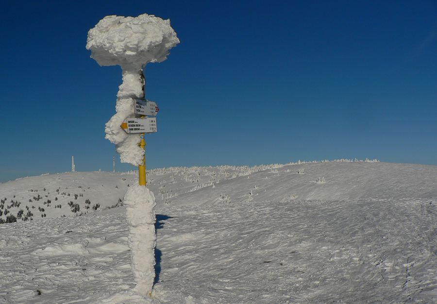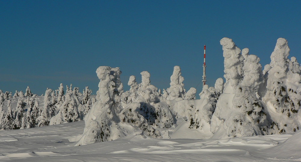 Krátky úsek od Vidlice na Veľkú lúku sa normálne ide v tuneli kosodreviny, teraz o meter a pol vyššie, vietor to tu poriadne zniveloval. Len pod nohami vlnky prevejov a okolo biele sochy omrznutých smrekov – krása!