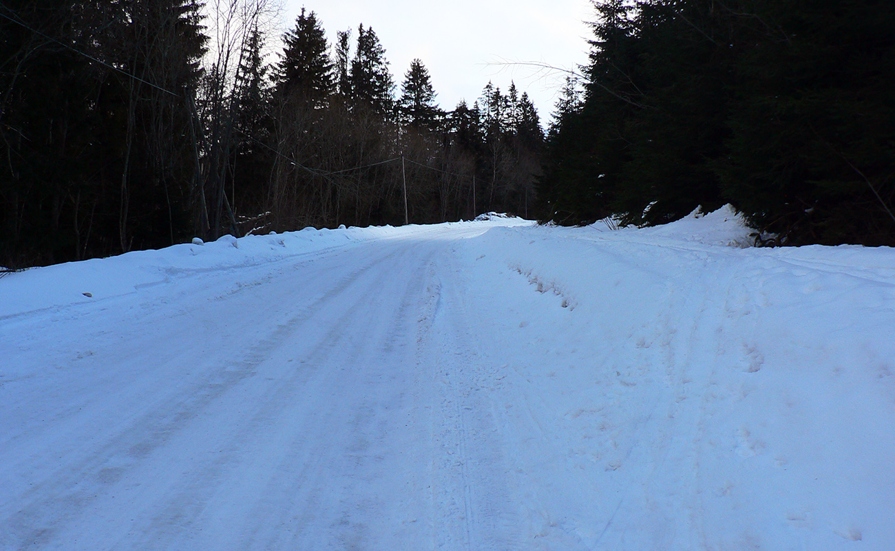 Rýchlo zbalíme a vyrazíme, hor sa do kopcov. No počasie vyzerá zatiaľ neprívetivo: tma, sivo, hore fúka južák. Pekne lesom po chodníčku, trošku strmšie ale na zohriatie akurát. Akurát Rišovi sa zdalo, že som veľmi rýchlo vypálil. Z lesa vyjdeme proti slnku na menšiu rúbaň a po zvážniciach smerujeme strmo hore vpravo. Sneh je celkom dobrý, ufúkaný a ešte suchý. No lebo ideme zo severu. Hore fúka viac a viac, mraky si dávajú preteky.