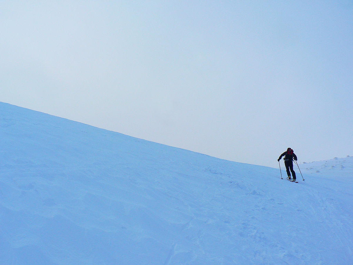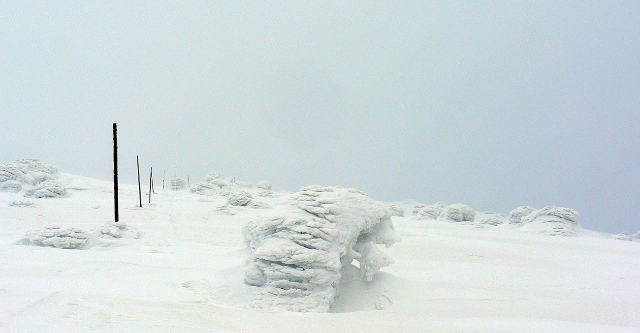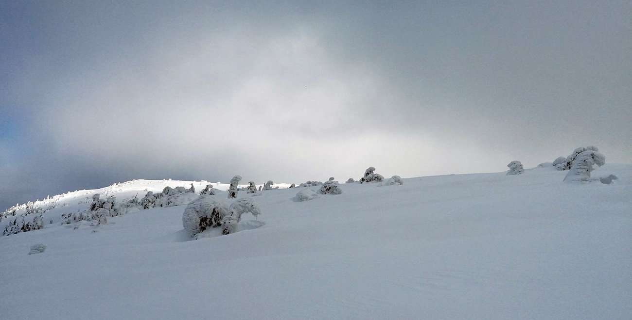 Smerujeme na hlavný hrebeň Nízkych Tatier, niekde okolo Skalky a Veľkej hole vraj ešte tie dobré terény budú. Na hrebeni fičalo slušne, rýchlo zbehneme pár metrov do závetria. Zhodíme pásy a smerom na východ dáme krátky zjazdík: trochu doska, niekde tvrdšie. Výhľad biedny. Ale lyžovačka fajná. Dole v jame dávame pásy a po malej, ale doležitej technickej oprave a uletenej rozprave šliapeme nazad na hrebeň. Dole v jame bolo bezvetrie, nádhera. Čím vyššie, tým viac sa fujak znova pripomína. Nie je veľmi zima, tak sa to dá prežiť, ale na hlavu k pot-čelenke šla veru kapucňa a Rišo si dal aj čiapku! Traverzujeme Veľkú hoľu smerom ku Skalke, míňame rôzne postavičky - krásne tvarované stromky. Vietor a Mráz - kamoši sa tu pohrali ako v ateliéri. Sochy na výstave. Výjavy všetkého druhu, najviac vidíme koní, modliacich sa pútnikov, veveričiek, nejaké obscénne výjavy sa nájdu tiež. Pekná krajina, človek sa hneď cíti lepšie a nie tak sám. Na západ Rišo sľubuje lepší sneh v zjazde, tak smerujeme k rebru, ktorým išiel včera dole do Lúžnej.