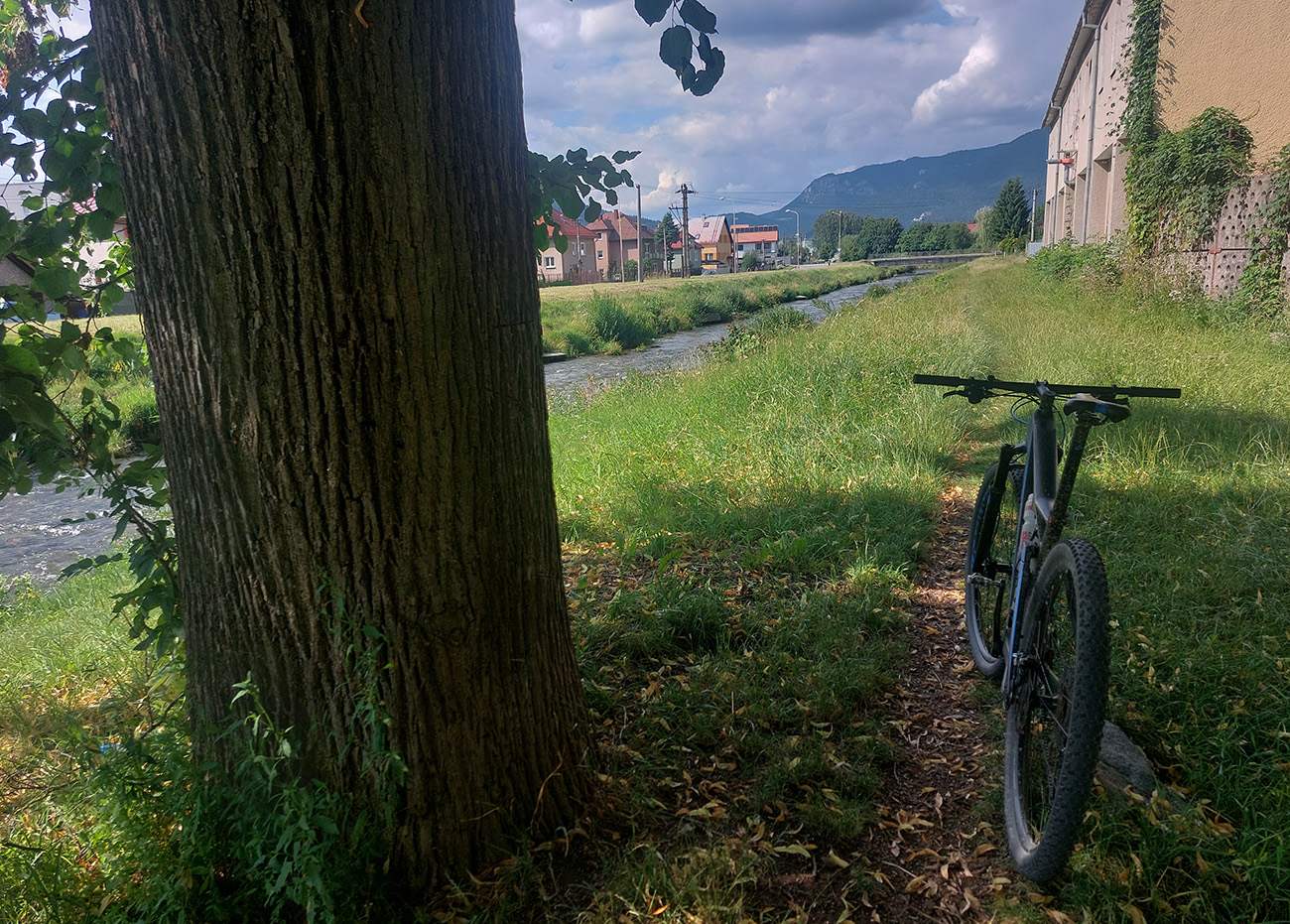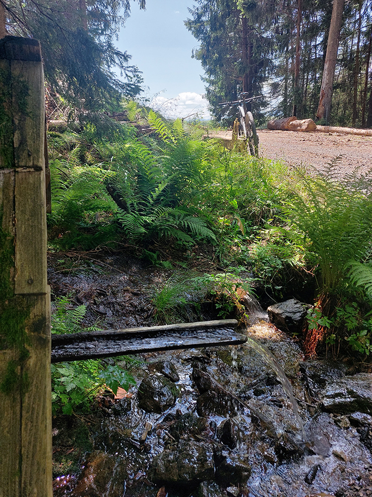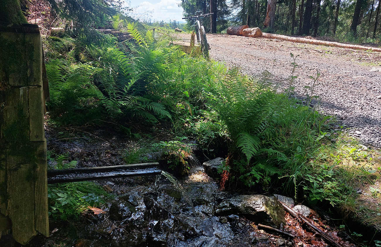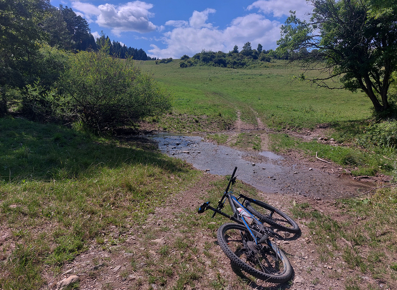 Ľupčianka je v ústí doliny už mohutnejšia, tak som pohrdol brodom, vyššie je mostík, na gpx-ku tú zachádzočku vidno. Pred Vyšným Sliačom som ochutnal miestnu minerálku – fajná je. No do bidónu som radšej netankoval, to až ďalej takú normálnu vodu, z výdatného prameňa Očianka tesne nad Štiavnicou.