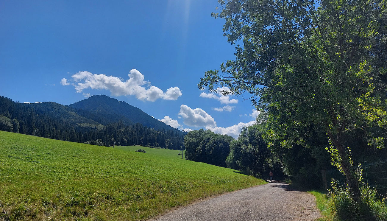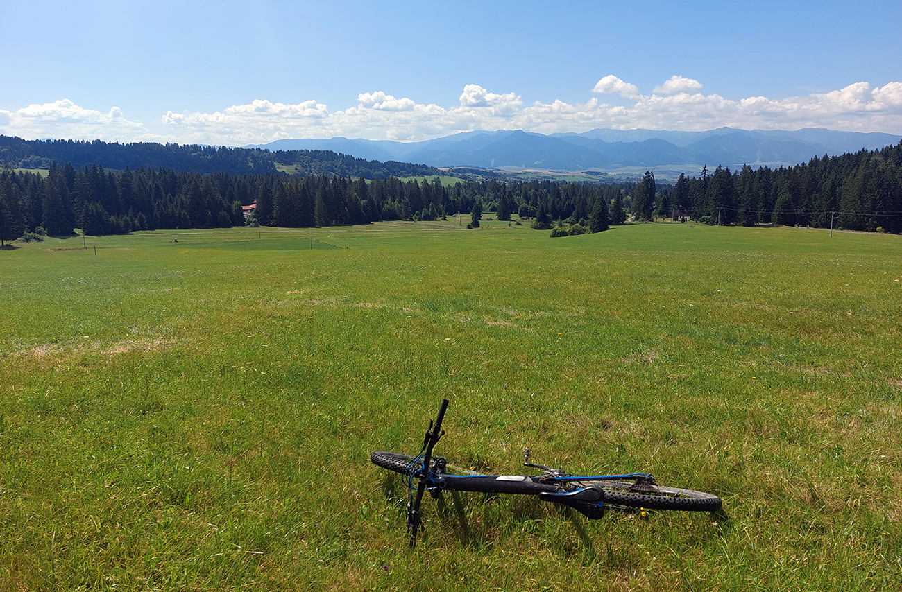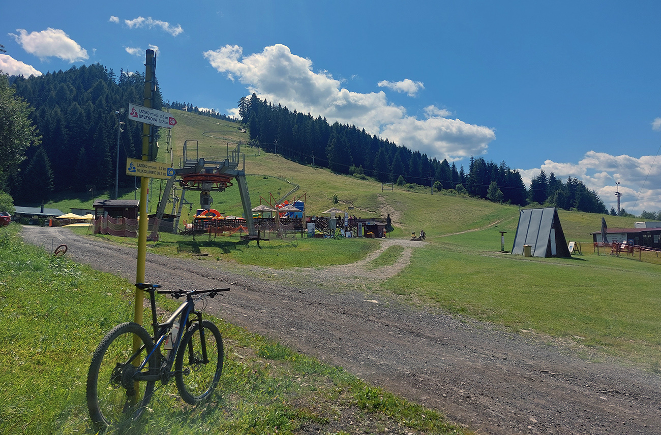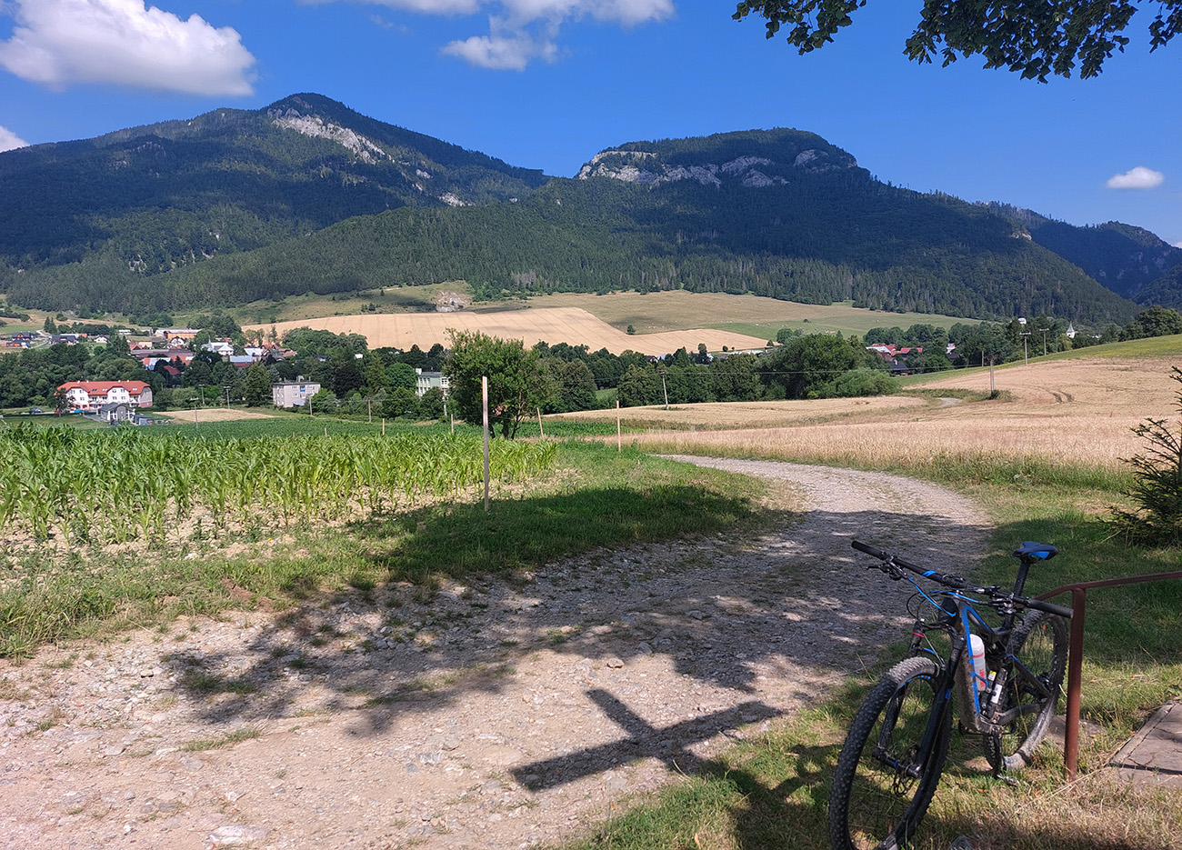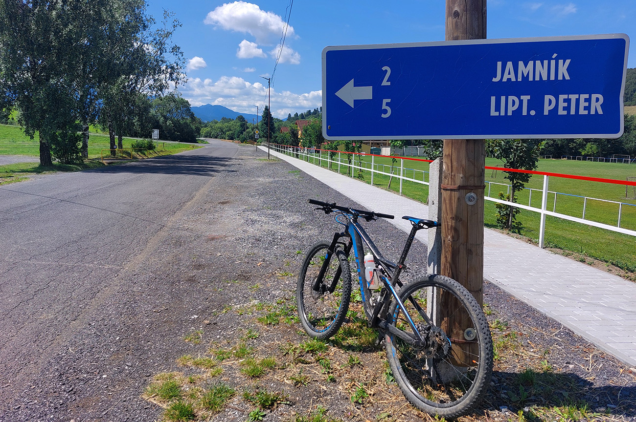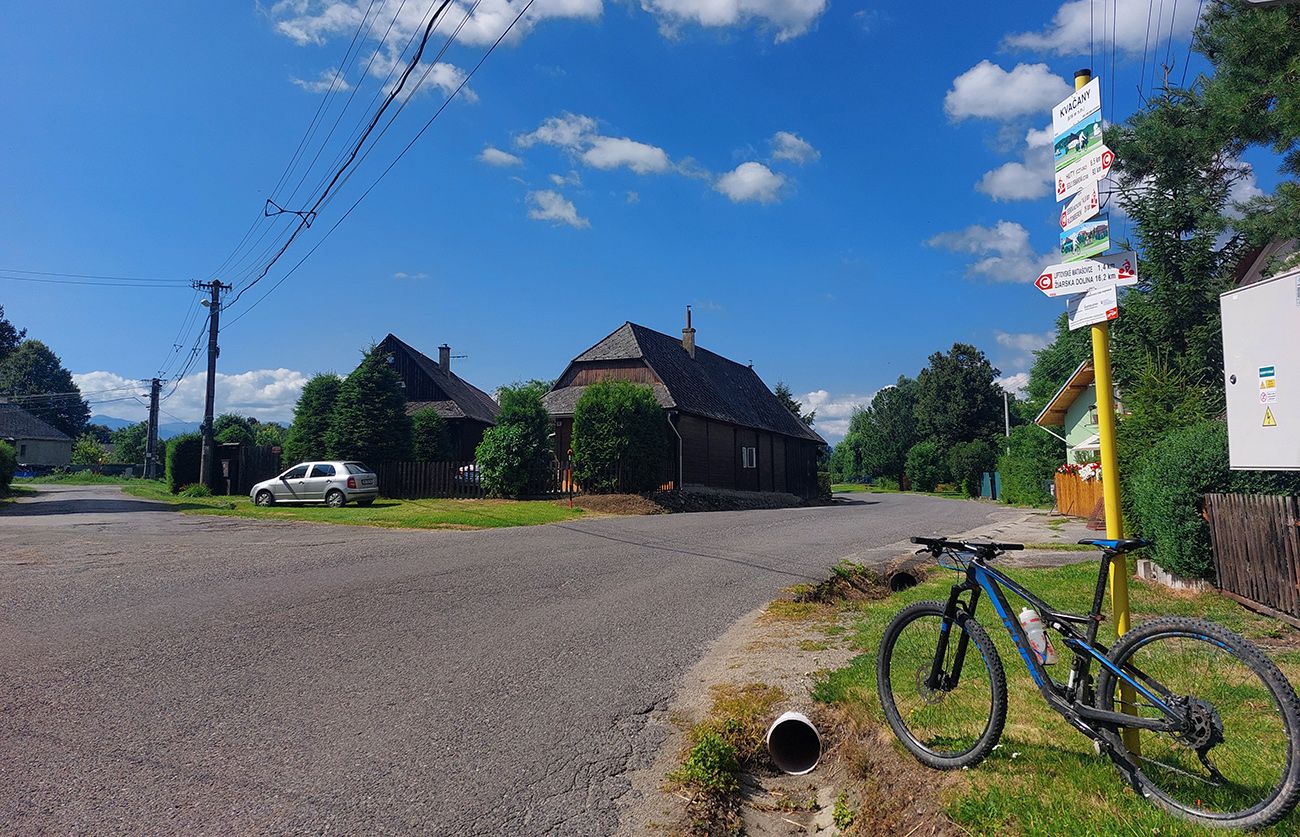 V okolí ústia Demänovskej doliny kopec gýčových dreveníc, vypipľaných chát a atrakcií pre turistov, pod kolesami sa strieda asfalt, šotolina aj tráva, len zľava stále les a doprava výhľady k Mikulášu cez guľaté pahorky podhoria. Plošín, Pavčina Lehota. Lazisko som obišiel ponad domy, cez lúku parádne vyjazdená stopa od bicyklov. Zámer zájsť si aj k najväčšiemu drevenému kostolu u nás síce bol, ale už som tam bol, nechcelo sa mi už.